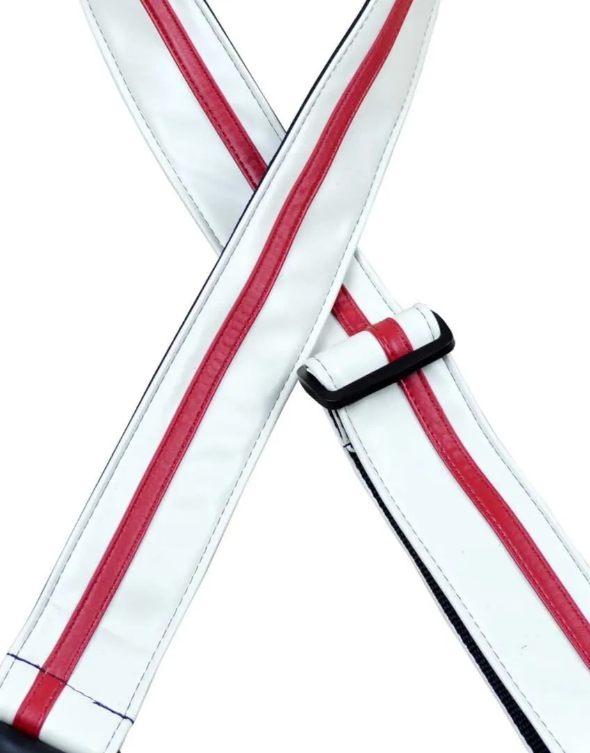 Strap featuring a laminate material with a contrasting stripe sewn onto the top. Folded and stitched onto 50mm webbing with 2mm genuine leather ends. Slide adjustable in length from 80cm to 130cm. Made in Australia.