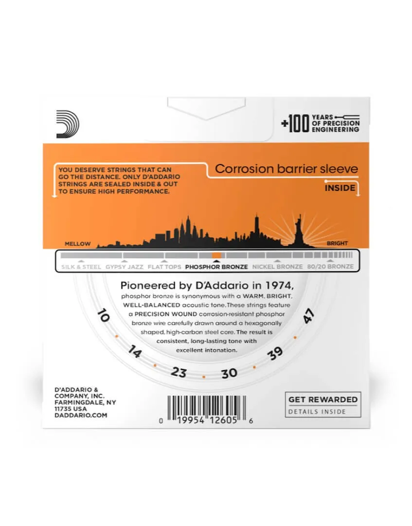 Phosphor Bronze was introduced to string making by D'Addario in 1974 and has become synonymous with warm, bright, and well balanced acoustic tone. D'Addario Phosphor Bronze strings are precision wound with corrosion resistant phosphor bronze onto a carefully drawn, hexagonally shaped, high carbon steel core. The result is long lasting, bright sounding tone with excellent intonation. Environmentally friendly, recyclable and corrosion resistant packaging makes for strings that are always fresh. All D'Addario strings are made in the U.S.A. for the highest quality and performance.