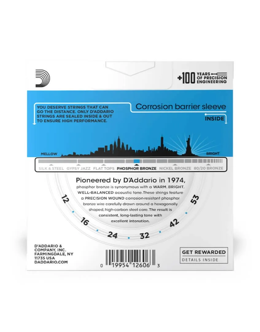 Phosphor Bronze was introduced to string making by D'Addario in 1974 and has become synonymous with warm, bright, and well balanced acoustic tone. D'Addario Phosphor Bronze strings are precision wound with corrosion resistant phosphor bronze onto a carefully drawn, hexagonally shaped, high carbon steel core. The result is long lasting, bright sounding tone with excellent intonation. Environmentally friendly, recyclable and corrosion resistant packaging makes for strings that are always fresh. All D'Addario strings are made in the U.S.A. for the highest quality and performance.