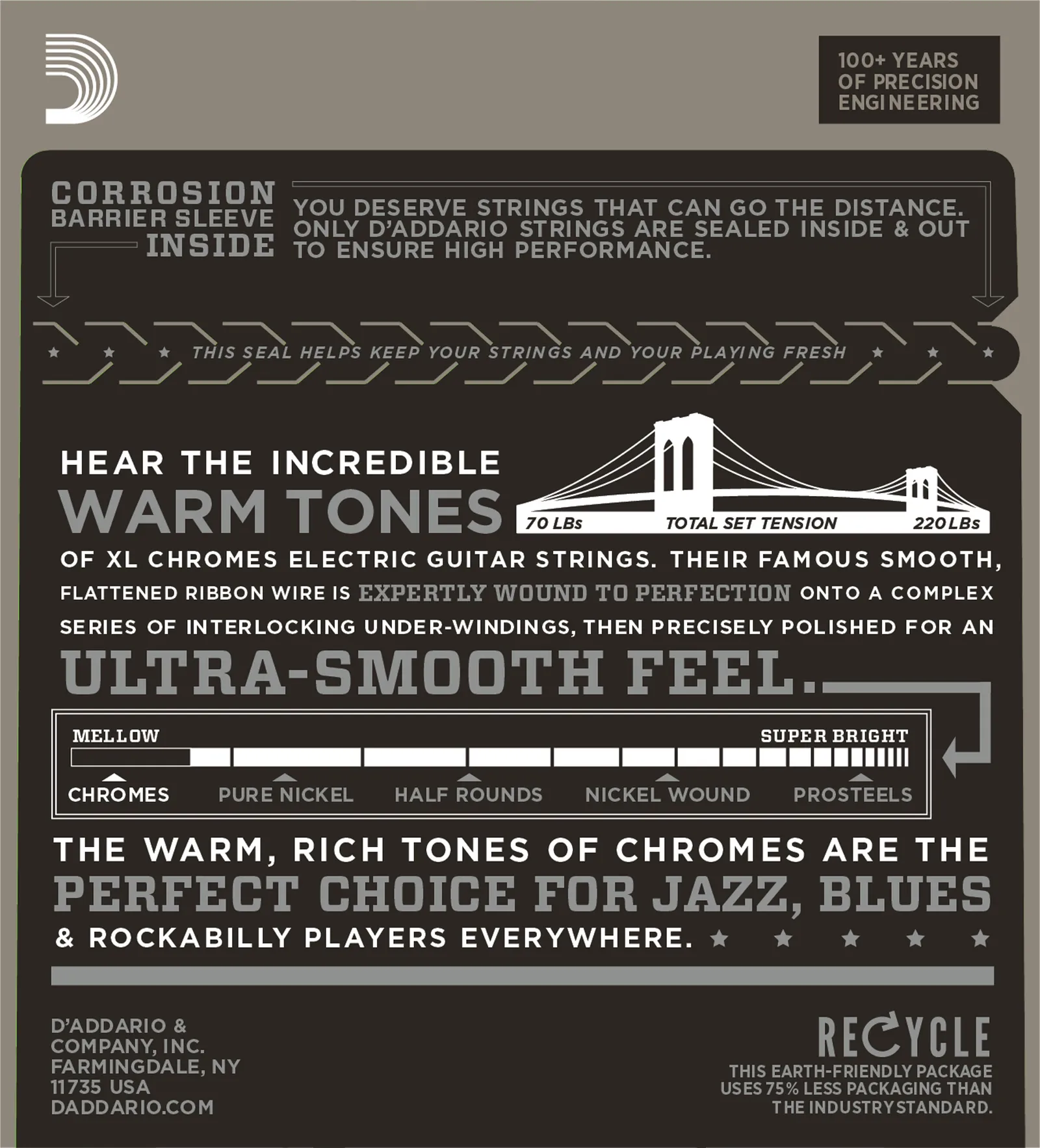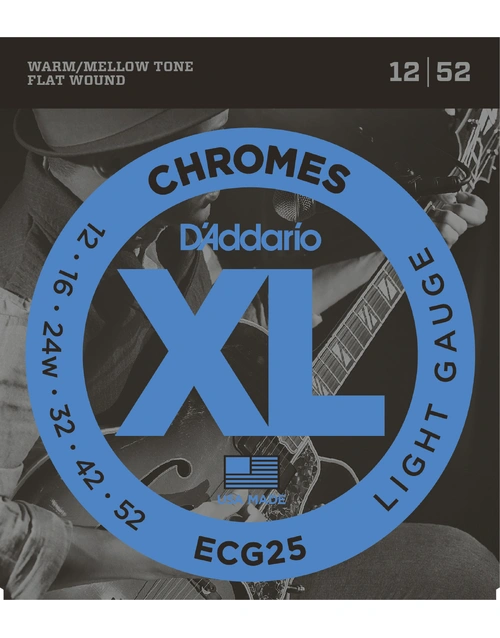 D'Addario XL Chromes are the industry standard in flatwound guitar strings. They deliver a round, full low end without losing punch, making them ideal for jazz players of all types. Wound with flattened stainless steel ribbon wire, then polished to unparalleled smoothness, it's no wonder that XL Chromes are the world's most popular flatwound strings.
