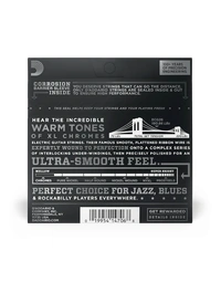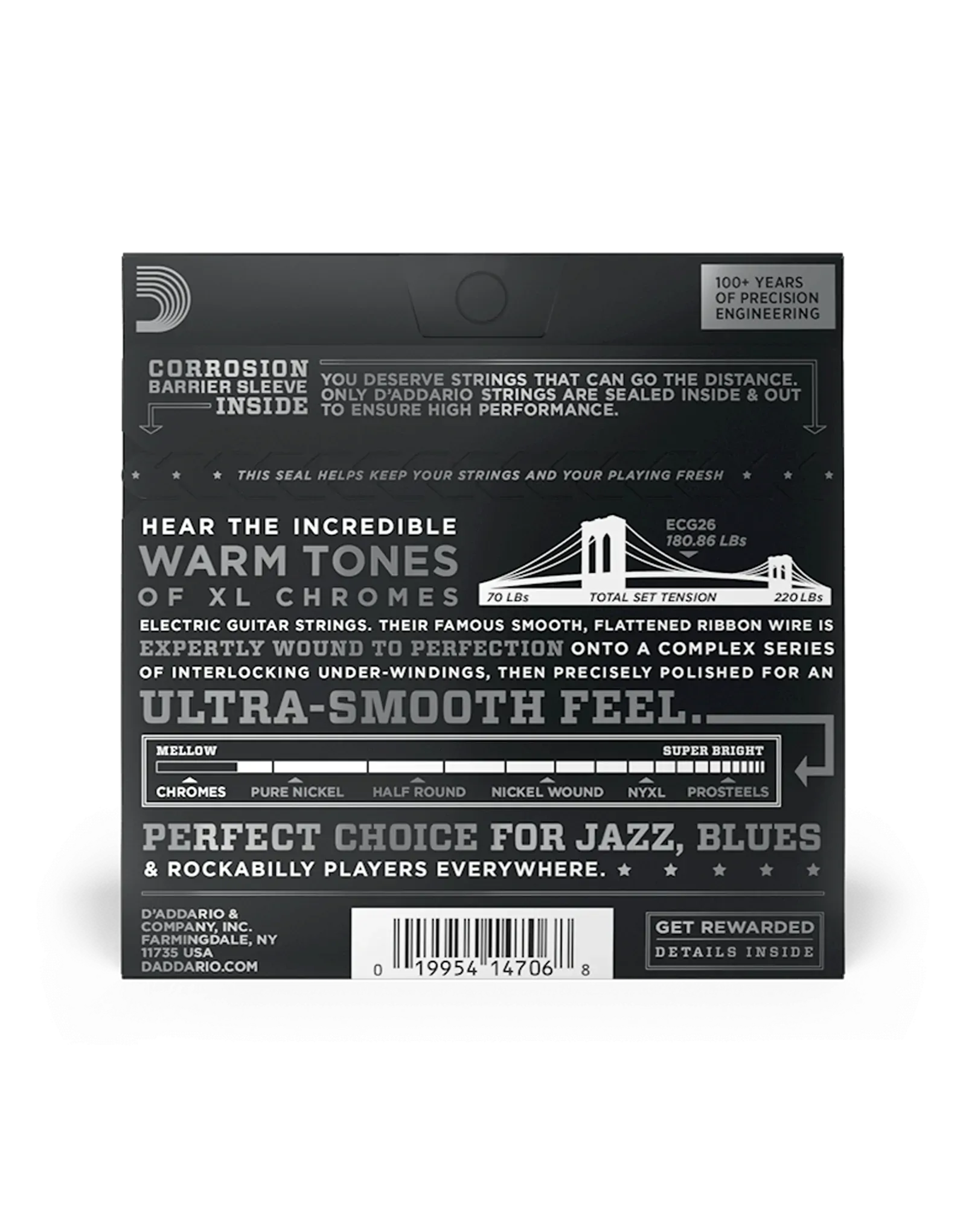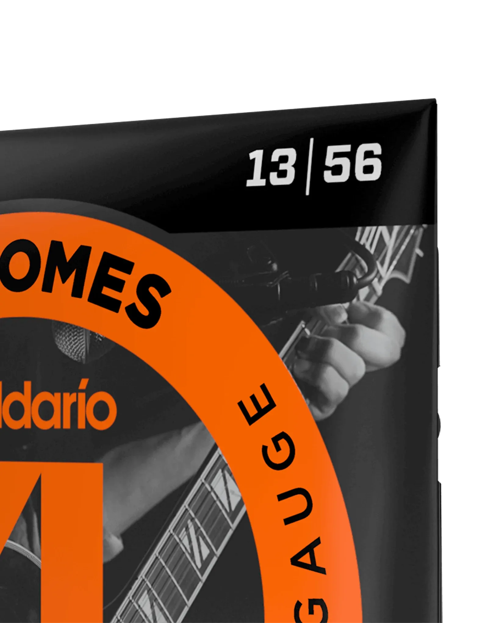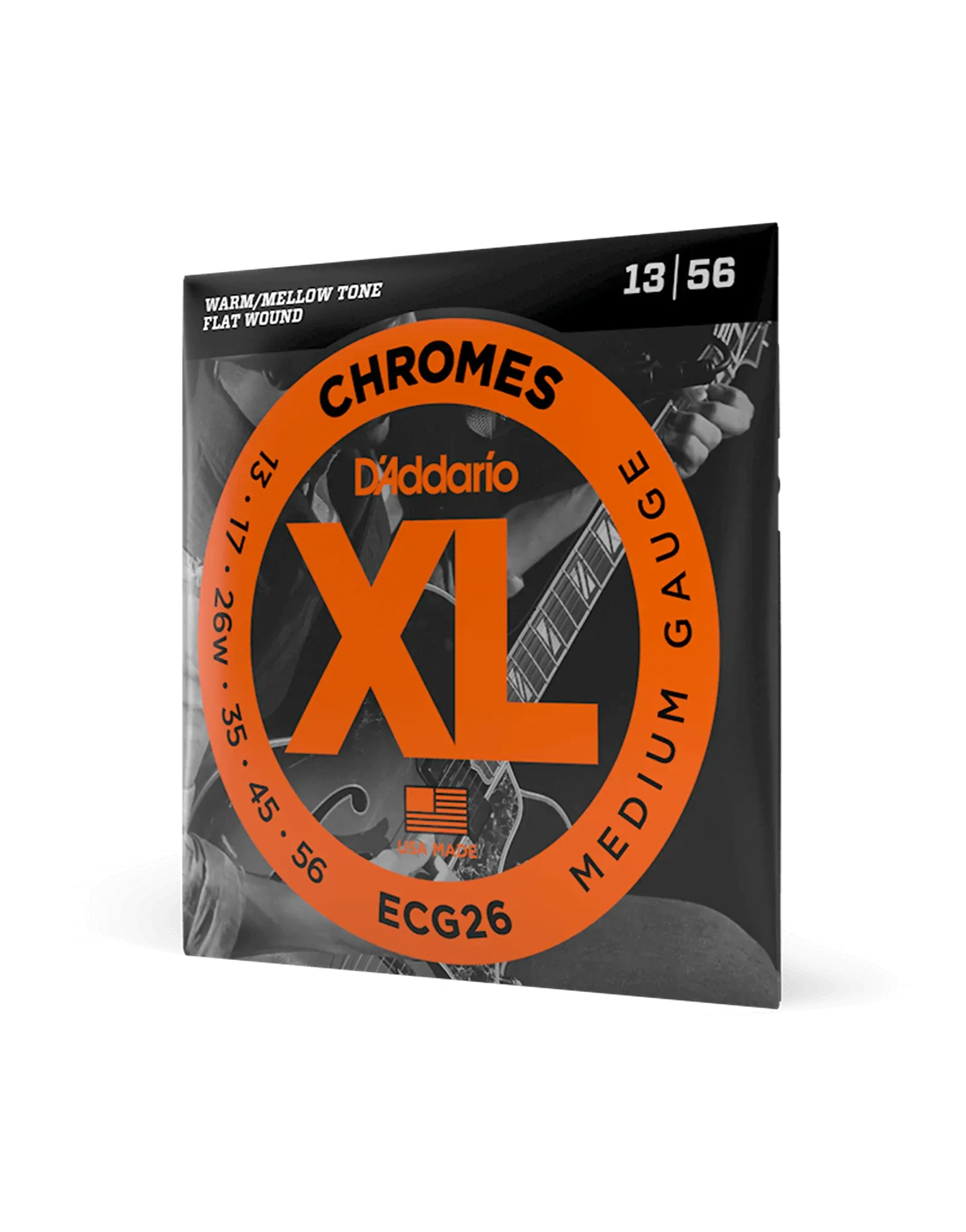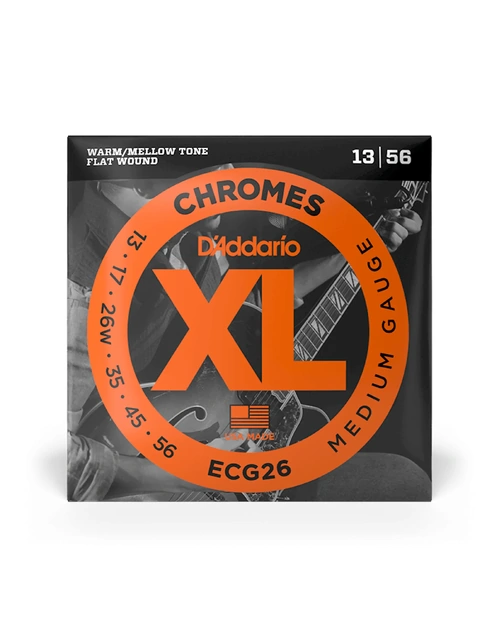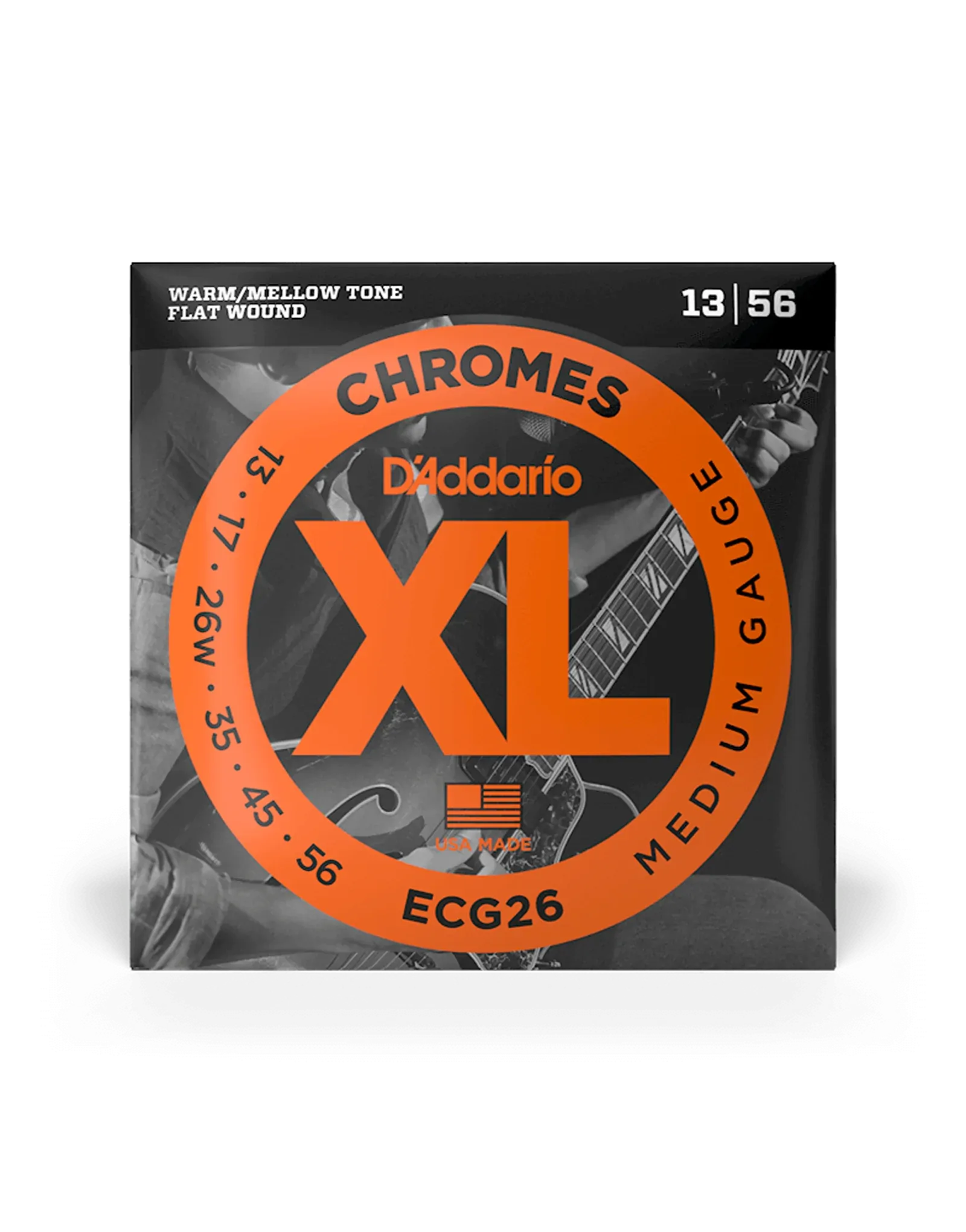 XL Chromes are D'Addario's warmest, mellowest electric guitar strings. Beloved by jazz guitarists, as well as blues legends like Gary Clark Jr., these flat wound strings provide the smoothest feel and warmest tone, while allowing movement across the fretboard with no finger noise. Made with a high carbon steel core, Chromes’ stainless steel flattened ribbon wire is expertly wound onto a series of interlocking under-windings, then precisely polished for unparalleled smoothness and a sound which blends beautifully into any mix. This 13-56 Medium set is D'Addario's heaviest gauge of flat wound strings, delivering maximum tension for the fullest tone and most resonance.