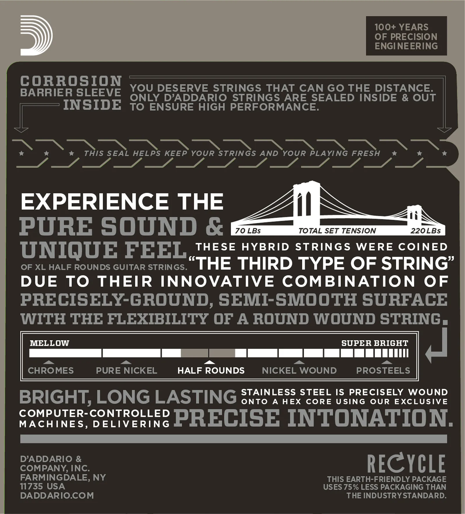 EHR370 combines the playability of a medium gauge set with the smooth feel and reduced finger noise of a half round string construction. The centerless grinding process used to finish XL Half Round strings delivers a smooth feel and reduced finger noise, with tone that's comparable to round wound strings.