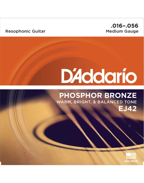 EJ42 6-string phosphor bronze Resophonic guitar strings offer a warm, well balanced acoustic tone, optimal resistance and comfortable feel. The standard in Resophonic strings!
