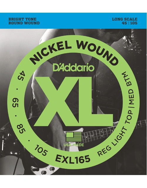 EXL165 is a popular D'Addario hybrid bass set combining the high strings from an EXL170 (.45 and .65) with the low strings from an EXL160 (.85 and .105). This set is optimal for players looking for the ideal combination of a comfortable playing tension with distinctive brightness and booming, tight lows. Fits basses with a string scale length of up to 36 1/4 inches.