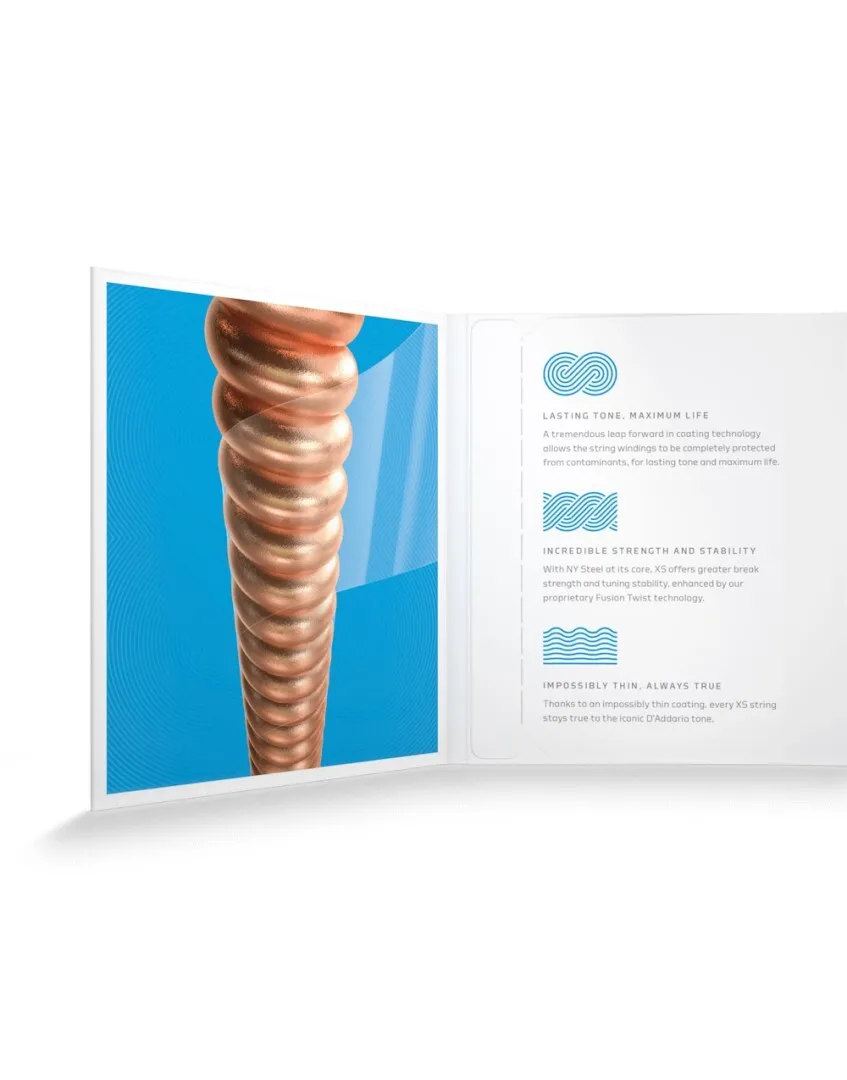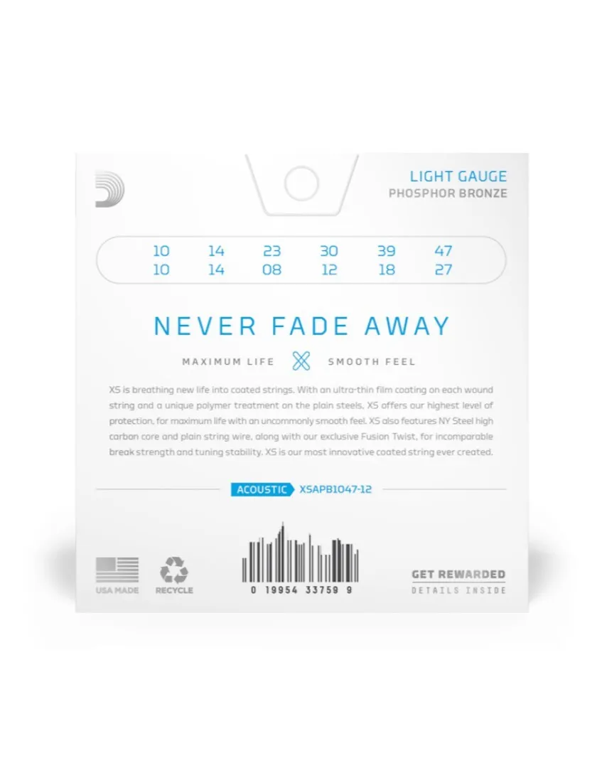 Crafted with precision using phosphor bronze wrap wire, these strings deliver the classic D'Addario acoustic tone. Expect a warm and well-balanced sound that suits various musical genres. The harmonics and overtones remain vibrant and bright, even after hours of intense playing, allowing your guitar's voice to shine through with clarity and richness. Featuring a NY Steel core and Fusion Twist technology, the XSAPB1047-12 XS strings exhibit exceptional break strength and unmatched tuning stability. They stay in tune an impressive 131% better than standard acoustic strings, providing you with the confidence to play and perform without worrying about constant retuning. Rest assured knowing that these XS coated acoustic strings are meticulously crafted in the USA, following D'Addario's stringent specifications for quality and performance.