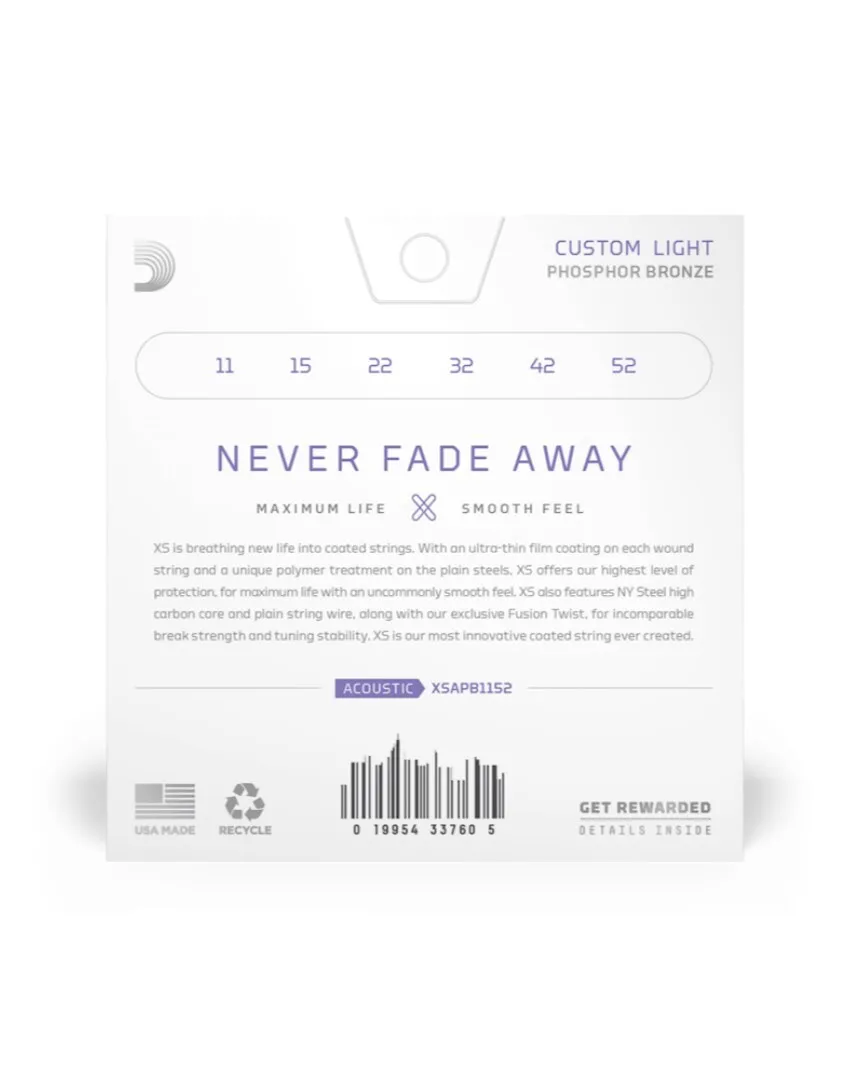 D'Addario XSAPB1152 XS Coated Phosphor Bronze Acoustic Guitar Strings Custom Light 11-52