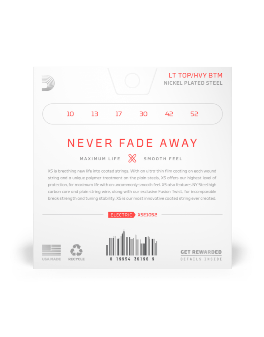 D'Addario XSE1052 XS Coated Electric Guitar Strings Light Top / Heavy Bottom 10-52 are premium strings, coated with the groundbreaking XS coating, providing maximum lifespan and a smooth, lightning-fast feel while maintaining their outstanding tone.