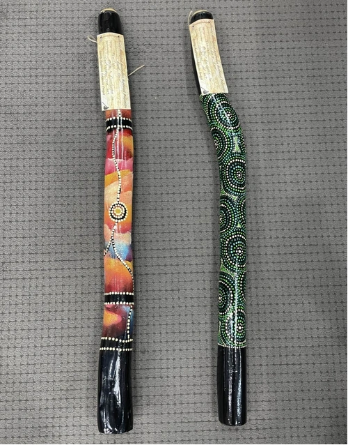 These didgeridoos are authentically made in Australia by genuine Aboriginal artists. Made from locally sourced timbers, the didgeridoos are white ant eaten wood and then drilled, finished with a wax mouth piece. Each instrument is supplied with information about the artist and timbers.