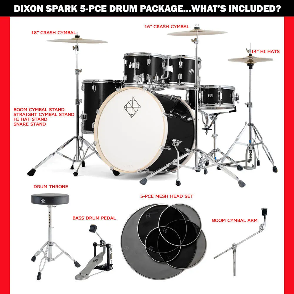 Dixon Spark Standard Series 5-piece drum kit is designed to give new drummers everything needed to start playing immediately. The kit includes a full shell pack, hardware, cymbals, and practice accessories, making it a practical starting point for home practice, lessons, or early band rehearsals. The 6-ply poplar shells produce a warm, balanced tone with enough projection to keep rhythms clear while remaining manageable in smaller practice spaces.