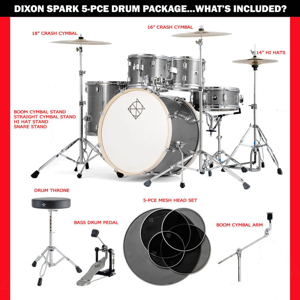| Stand hardware (Included) | Dixon boom cymbal stand, straight cymbal stand, hi-hat stand, snare stand, single bass drum pedal, drum throne, boom cymbal arm for 4-piece conversion |
