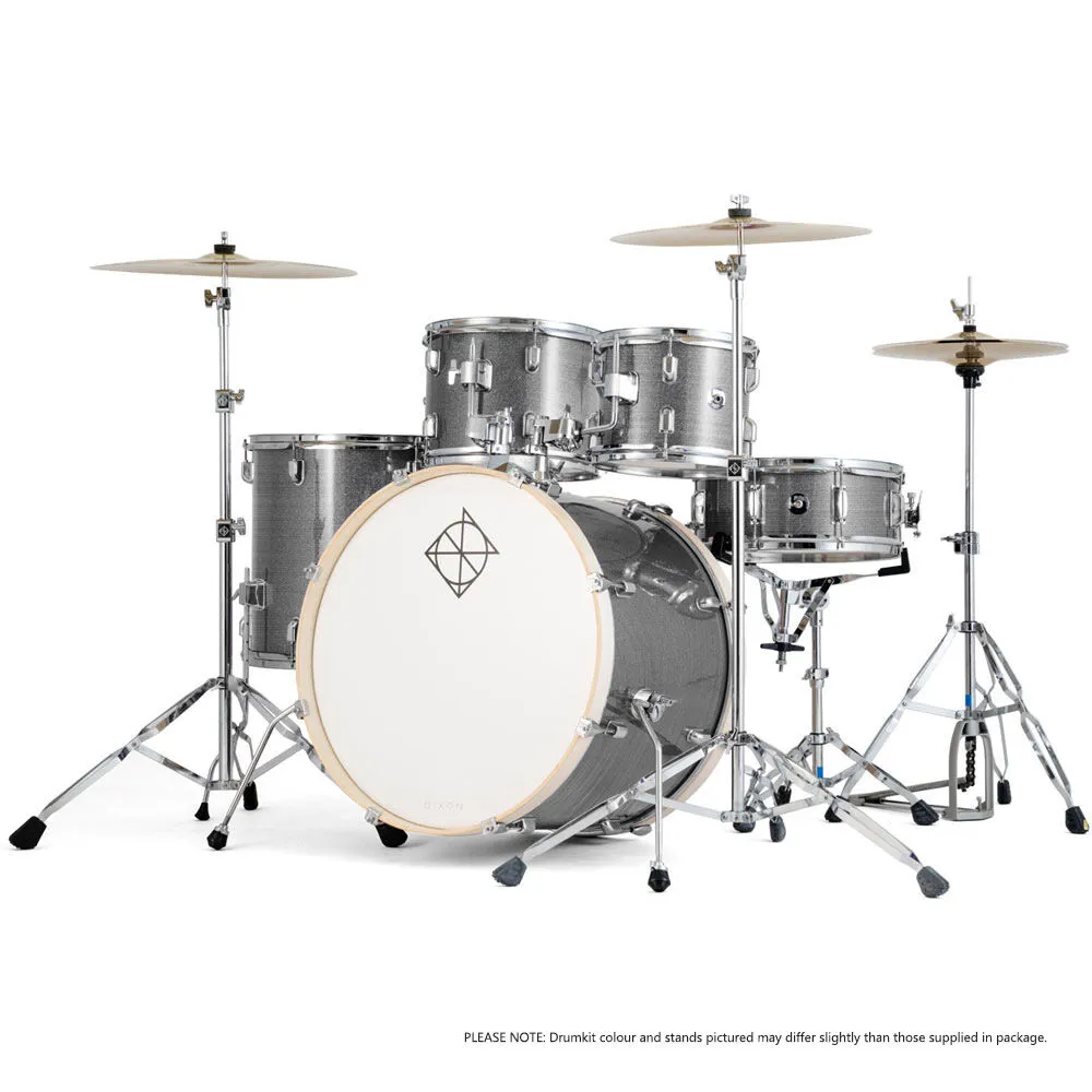 A 5-piece drum kit with a 22 inch bass drum gives new drummers a fuller low-end response and a more band-ready feel than smaller starter kits. The Dixon Spark Standard Series uses 6-ply poplar shells, which produce a warm, balanced tone with enough projection for rehearsal while remaining controllable in home practice settings. The 22 inch bass drum adds weight and depth to kick tones, while the 12 inch and 13 inch toms and 16 inch floor tom create a wider tuning range for fills and groove-based playing.