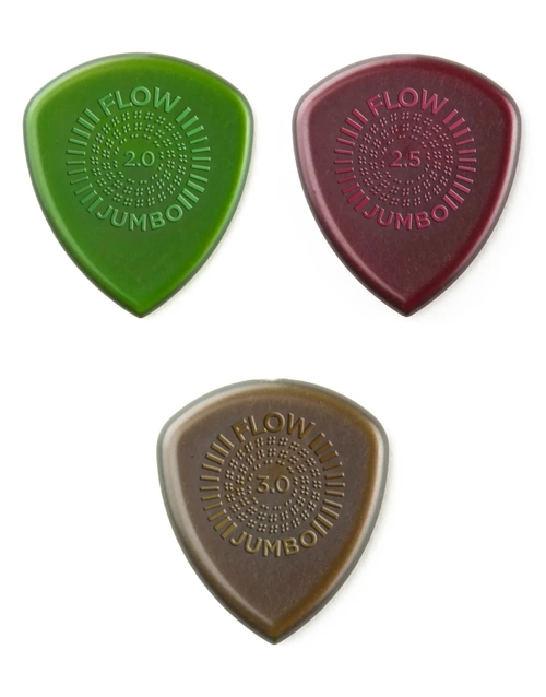 Flow Picks add thickness and volume to each note you play while allowing every pick-stroke to fall smoothly and effortlessly from your strings thanks to bright, durable Ultex material, a wide angle and sharp tip to focus your attack, a uniform bevel that reduces string drag, and a low-profile grip just the right amount of control.