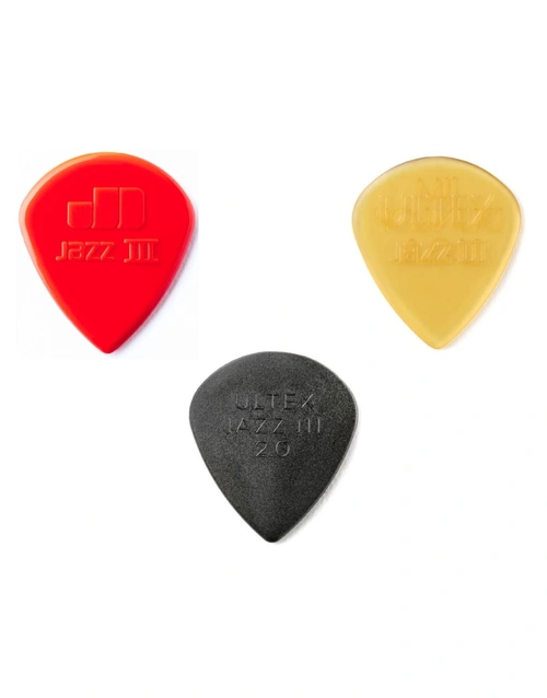 It's no wonder the Jazz III Nylon Pick has gained such a huge following among a variety of the world's top guitar players—its very shape is designed to let your technique take over. With a small profile, quick-release moulded edge, and a sharp tip, the Jazz III gives you the control you need to play with speed and precision while notes ring out with clarity. Available in the warm sounding Red Nylon or the brighter, more aggressive sounding Black “Stiffo.” Also available in the yellow Ultex Jazz III 2.0, which combines the durability, sharp attack, and light weight of Ultex with the newly designed hybrid Jazz III sculpted tip.