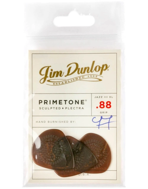 Get the Jazz III XL shape's tight manoeuvrability and laser-guided, lightning-fast tip with the hand-burnished bevelled edges and flexible, snappy attack of Primetone Sculpted Plectra. Dunlop's Primetone Sculpted Plectra will glide off your strings and bring out the true voice and clarity of your instrument. They're made from Ultex for maximum durability and tonal definition, with hand-burnished sculpted edges for fast, articulate runs and effortless strumming.