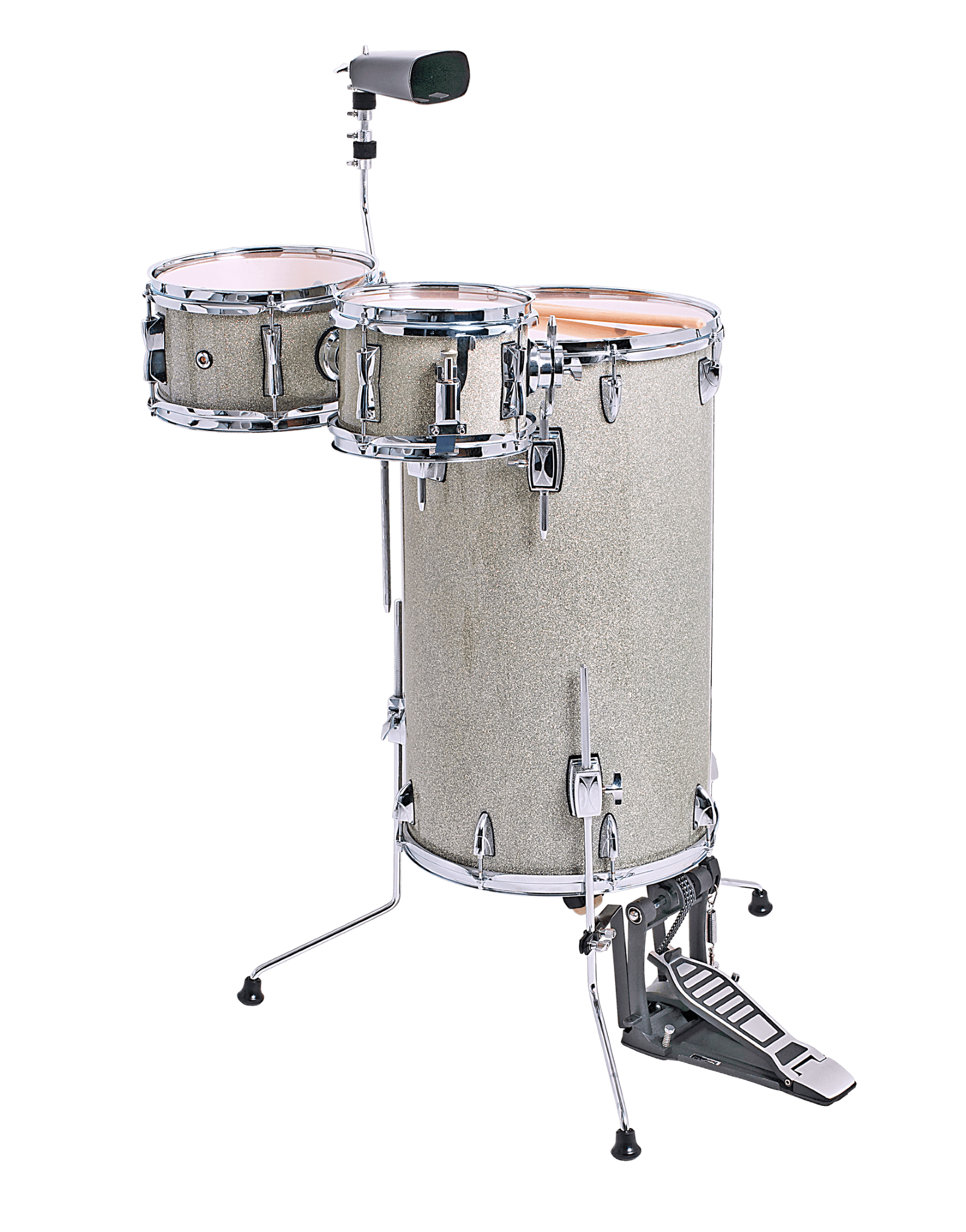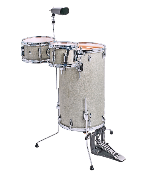 The DXP 3-Piece Cocktail Kit Silver Sparkle is a 3 piece portable drum kit to be played while standing upright. Features 6 ply, 7.5mm Birch shells, with a 15"x25" vertical bass drum (16 lugs), 8"x5.5" mounted snare drum (4 double lugs) and 10"x5.5" mounted tom (5 double lugs). Heavy duty mounts, bass drum pedal, and cowbell included.