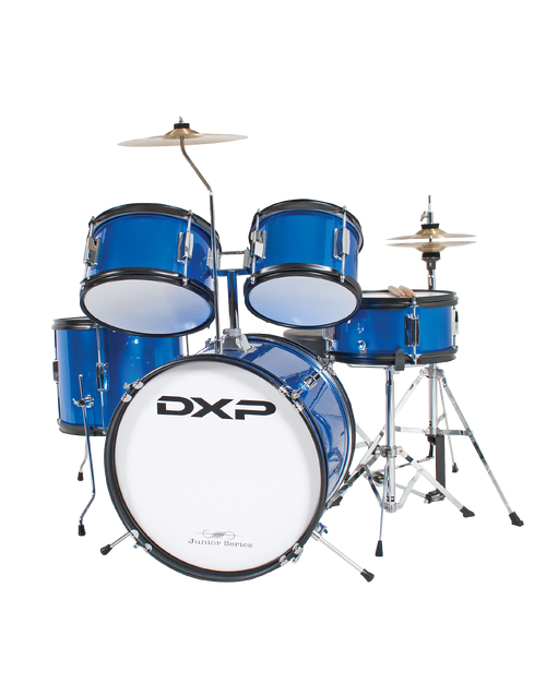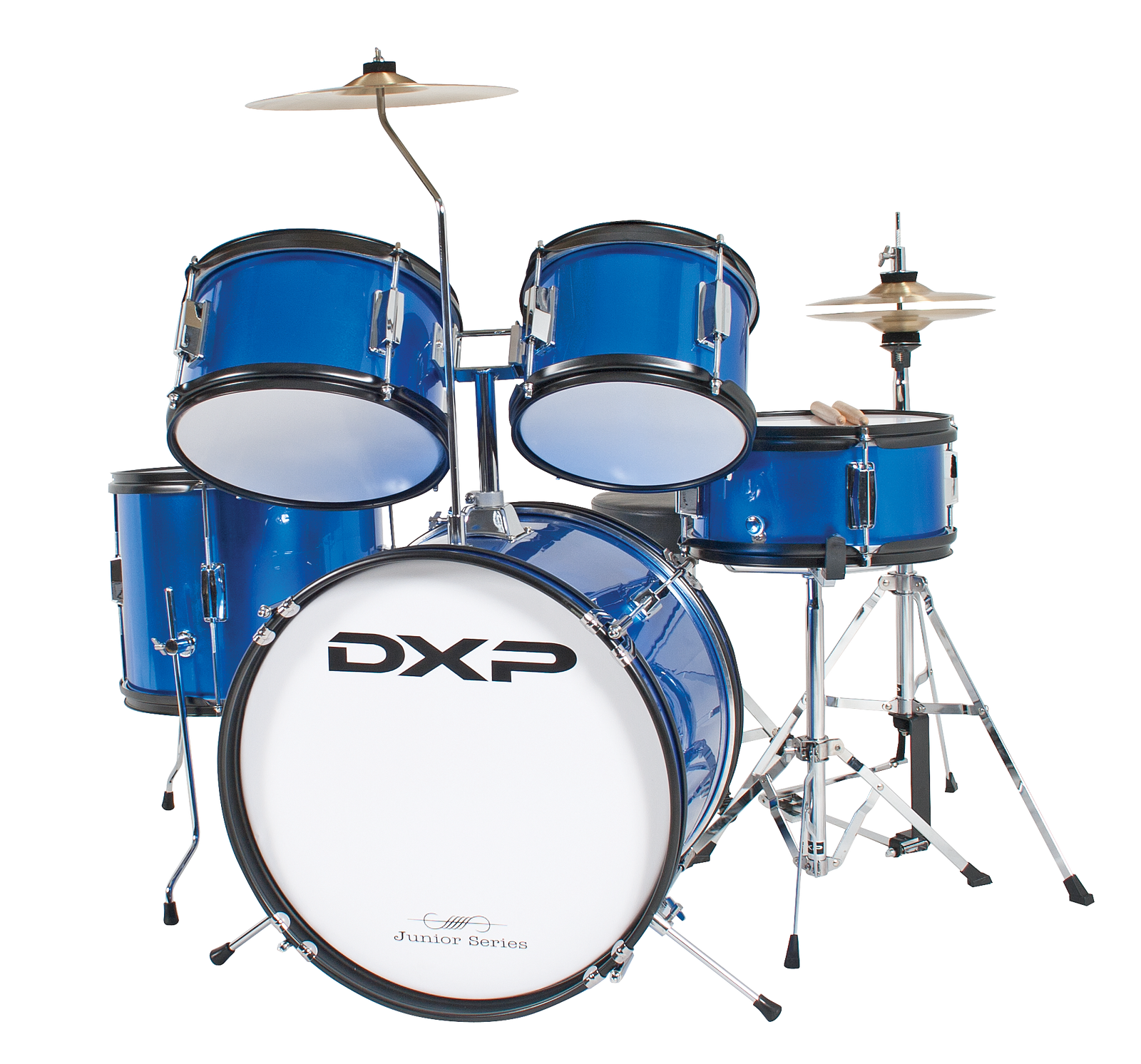 DXP Junior Series 5 piece drum outfit. Comprises 16"x11" bass drum (4 double lugs), 12"x10" floor tom (4 double lugs), 10"x6" tom tom (4 double lugs), 8"x6" tom tom (4 double lugs), 10"x5" coloured shell snare drum (4 double lugs), tom tom holder, cymbal holder, 12" cymbal on holder, 8" hi-hat cymbals on stand, drum throne, snare stand, bass pedal and pair of drum sticks.