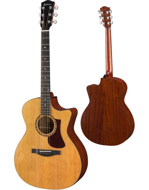 The Eastman AC122-2CE Grand Auditorium Solid Cedar/Sapele C/E features a solid Cedar top, and solid Sapele back & sides, for a naturally resonant and well-balanced acoustic tone. The premium quality tonewoods look incredible with a satin TrueTone finish. TrueTone is an environmentally friendly finish, with the same consistency and superior tonal characteristics as nitrocellulose. A Traditional Even C-profile Mahogany neck, with an Ebony fretboard, offer smooth playability, and a grand auditorium body shape with cutaway give you hours of comfortable playability. A Fishman Sonitone pickup ensures your Eastman sounds just as good plugged in, as it does acoustically.