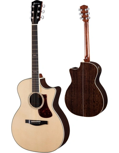 The Eastman AC422CE-AE Grand Auditorium Solid Spruce/Eucalyptus C/E features a solid Sitka Spruce top, and solid Aged Eucalyptus back & sides, for a naturally resonant and well-balanced acoustic tone. The premium quality tonewoods look incredible with a Gloss TrueTone finish. TrueTone is an environmentally friendly finish, with the same consistency and superior tonal characteristics as nitrocellulose. A Traditional Even C-profile Mahogany neck, with an Ebony fretboard, offer smooth playability, and a grand auditorium body shape with cutaway give you hours of comfortable playability. An LR Baggs Element EAS VTC ensure your Eastman sounds just as good plugged in, as it does acoustically.