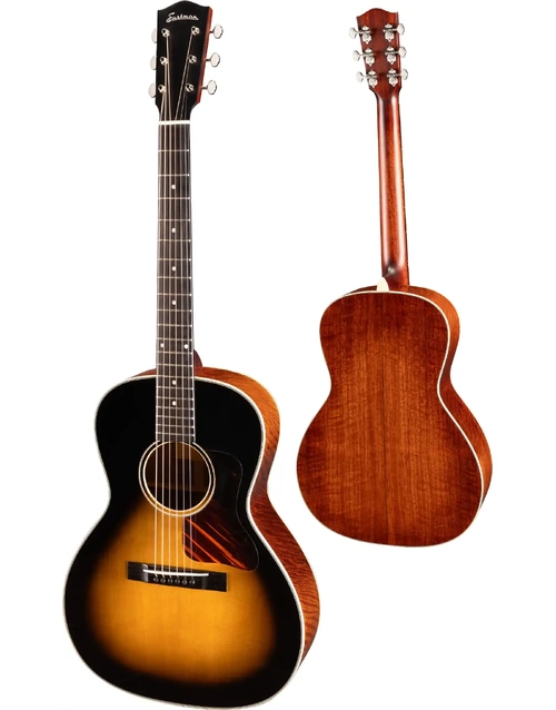 The Eastman E10OOSS-TC-SB is a beautifully crafted slope-shoulder OO acoustic guitar, offering vintage-inspired tone and aesthetics. Featuring a solid Thermo-Cured Adirondack spruce top and solid mahogany back and sides, this guitar delivers warm, articulate tones with excellent projection. The hand-carved scalloped X-bracing enhances resonance, while the Traditional Even "C" mahogany neck with an ebony fingerboard provides a comfortable and smooth playing experience. A 24.75” scale length and compact 14-3/4” body make it highly responsive for fingerstyle and strumming alike. Vintage details such as ivoroid binding, pearl dot inlays, a firestripe pickguard, and a Truetone Sunburst gloss finish add to its elegant appeal. Open-gear PingWell tuners ensure reliable tuning stability, and the guitar includes a deluxe hardshell case for protection.