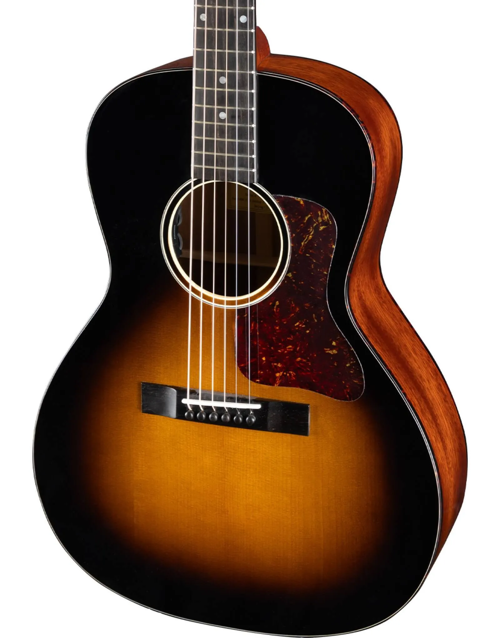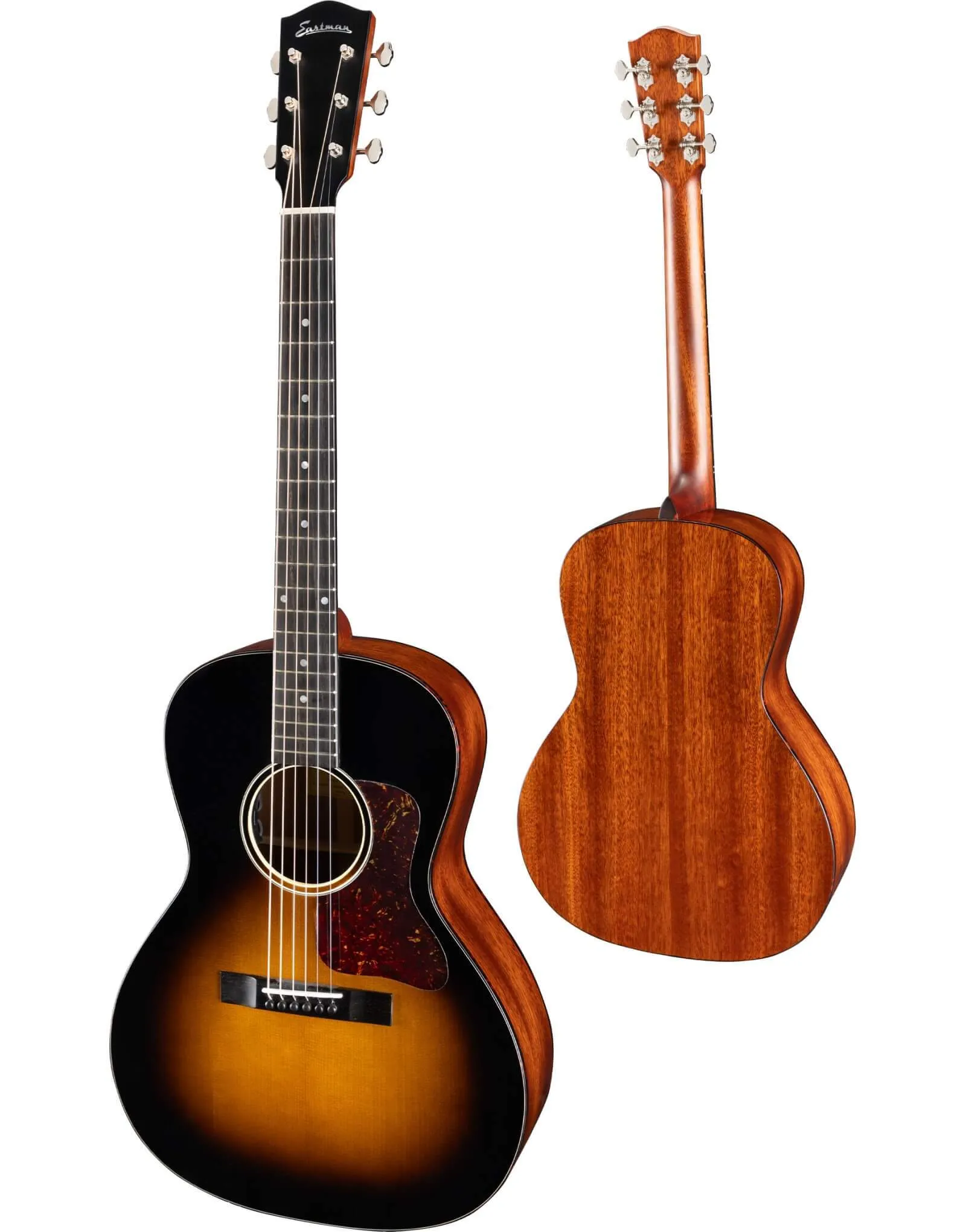The Eastman E1OOSS-DLX is a slope shoulder OO body featuring a solid Sitka Spruce top and solid Sapele back & sides. These premium quality tonewoods look incredible with a Gloss TrueTone Sunburst finish. TrueTone is an environmentally friendly finish, with the same consistency and superior tonal characteristics as nitrocellulose. The small OO body provides a sharp focussed tone with attack and bark. The Sapele produces a balanced tone with plenty of mid range; similar to Mahogany, but with a slightly brighter tone and more shimmer in the top-end. Utilising a hand carved scalloped X bracing allows the body to resonate, producing volume and bass you wouldn't normally expect from a package this size. The guitar is decked out with a Fishman Presys TV pickup, ebony fretboard, tortoise binding, pearl dot inlays, tortoiseshell pickguard and includes a padded gig bag.
