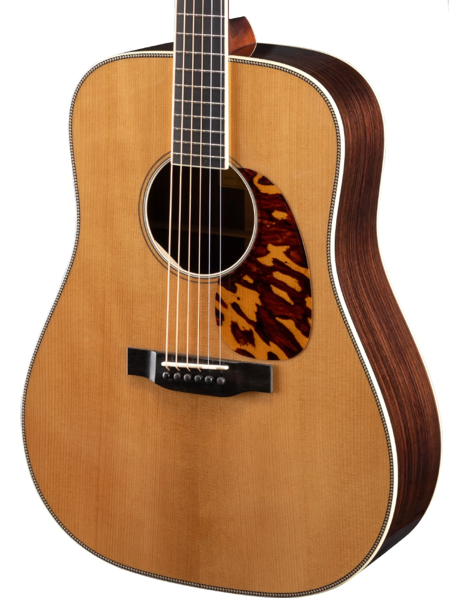 The Eastman E20D-TC-LSH Traditional Thermo-Cured Solid Adirondack/Rosewood Large Sound Hole Dreadnought Acoustic Guitar is a premium instrument designed for players who demand exceptional tone and craftsmanship. The solid Thermo-Cured Adirondack spruce top offers a dynamic, responsive sound, with the curing process enhancing the tonal characteristics and overall resonance. The solid rosewood back and sides provide a rich, full-bodied tone with excellent projection and clarity. The hand-carved scalloped X bracing ensures optimal tonal balance, while the mahogany neck with a traditional Even "C" profile and ebony fingerboard delivers smooth, comfortable playability. The large sound hole rosette and herringbone binding give this guitar a classic, vintage-inspired look, complemented by abalone snowflake inlays and ebony bridge pins with abalone inlay. Finished in Truetone Gloss, this guitar offers both stunning aesthetics and powerful, rich sound, making it ideal for performing or recording.