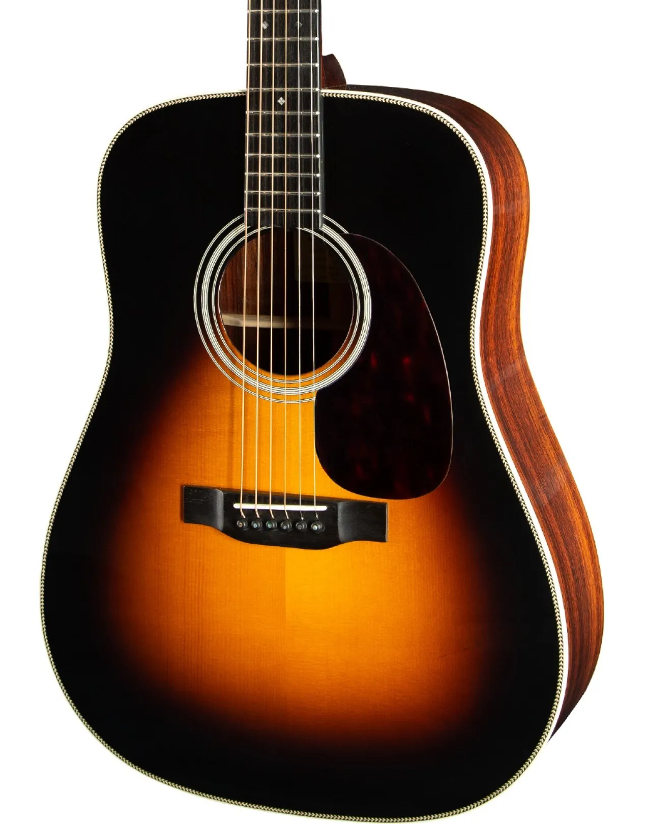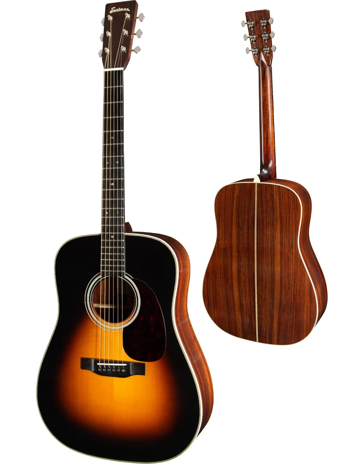 The Eastman E20D-TC-SB Traditional Thermo-Cured Solid Adirondack/Rosewood Dreadnought Acoustic Guitar Sunburst features a thermally treated solid Adirondack Spruce top, and solid Rosewood back & sides, for a naturally resonant and well-balanced acoustic tone. Eastman's thermal treatment gives the E20D-TC the feel and tone of an aged-in guitar, delivering the perfect blend of fundamental tone and harmonics. The premium quality tonewoods look incredible with a Gloss TrueTone finish.TrueTone is an environmentally friendly finish, with the same consistency and superior tonal characteristics as nitrocellulose. A Traditional Even C-profile Mahogany neck, with an Ebony fretboard, offer smooth playability, and a dreadnought body shape gives you plenty of projection to cut through the mix.