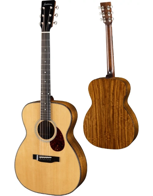 The Eastman E3OM-DLX is a premium orchestra model acoustic guitar, offering a balanced tone and refined craftsmanship. Featuring a solid Sitka spruce top and solid ovangkol back and sides, this guitar delivers rich projection, clear articulation, and a warm low-end response. The hand-carved scalloped X-bracing enhances resonance, while the Traditional Even "C" mahogany neck with an ebony fingerboard ensures smooth, comfortable playability. A 24.9” scale length and 15” body size make this OM model highly responsive for both fingerstyle and strumming. The Fishman Presys VT electronics provide natural amplified tone, making it stage and studio-ready. Elegant details like herringbone binding, pearl dot inlays, and a Truetone gloss finish complete its classic aesthetic. Comes with a deluxe padded Eastman gig bag for protection.