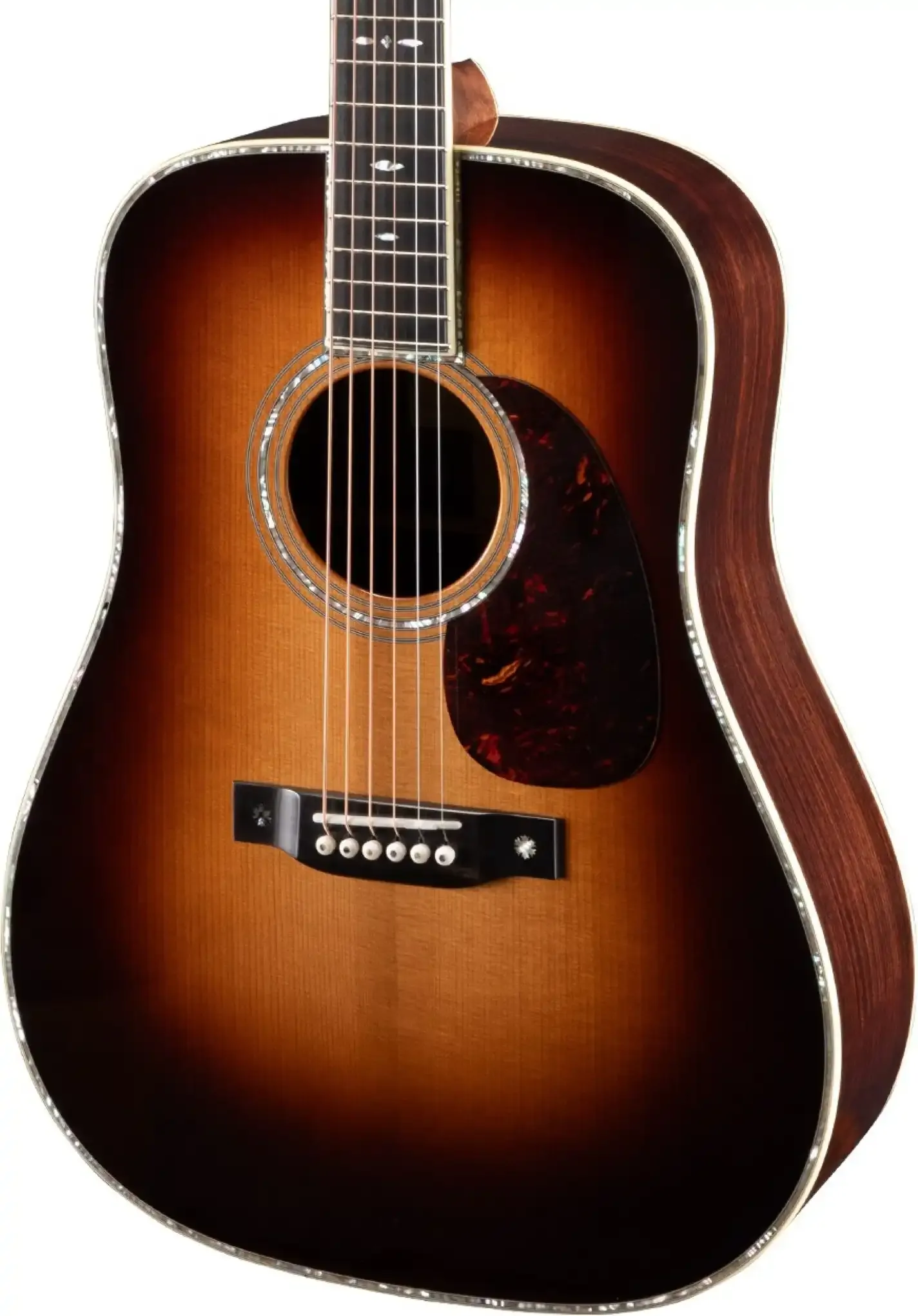 The Eastman E40D-TC-SB is a premium dreadnought acoustic guitar, blending traditional craftsmanship with modern tonal refinement. Featuring a solid AAA-grade Thermo-Cured Adirondack spruce top and solid rosewood back and sides, this guitar delivers powerful projection, deep bass, and articulate highs. The hand-carved scalloped X-bracing enhances resonance and responsiveness, while the Traditional Even "C" mahogany neck with an ebony fingerboard provides a comfortable playing experience. Abalone snowflake inlays, ivoroid binding, and a stunning Sunburst Truetone gloss finish give this model an elegant, vintage aesthetic. Gotoh SXB510-N tuners ensure precise tuning stability, while the bone nut and saddle contribute to its exceptional sustain. Complete with a tortoiseshell pickguard and a deluxe hardshell case, this dreadnought is built for serious players.