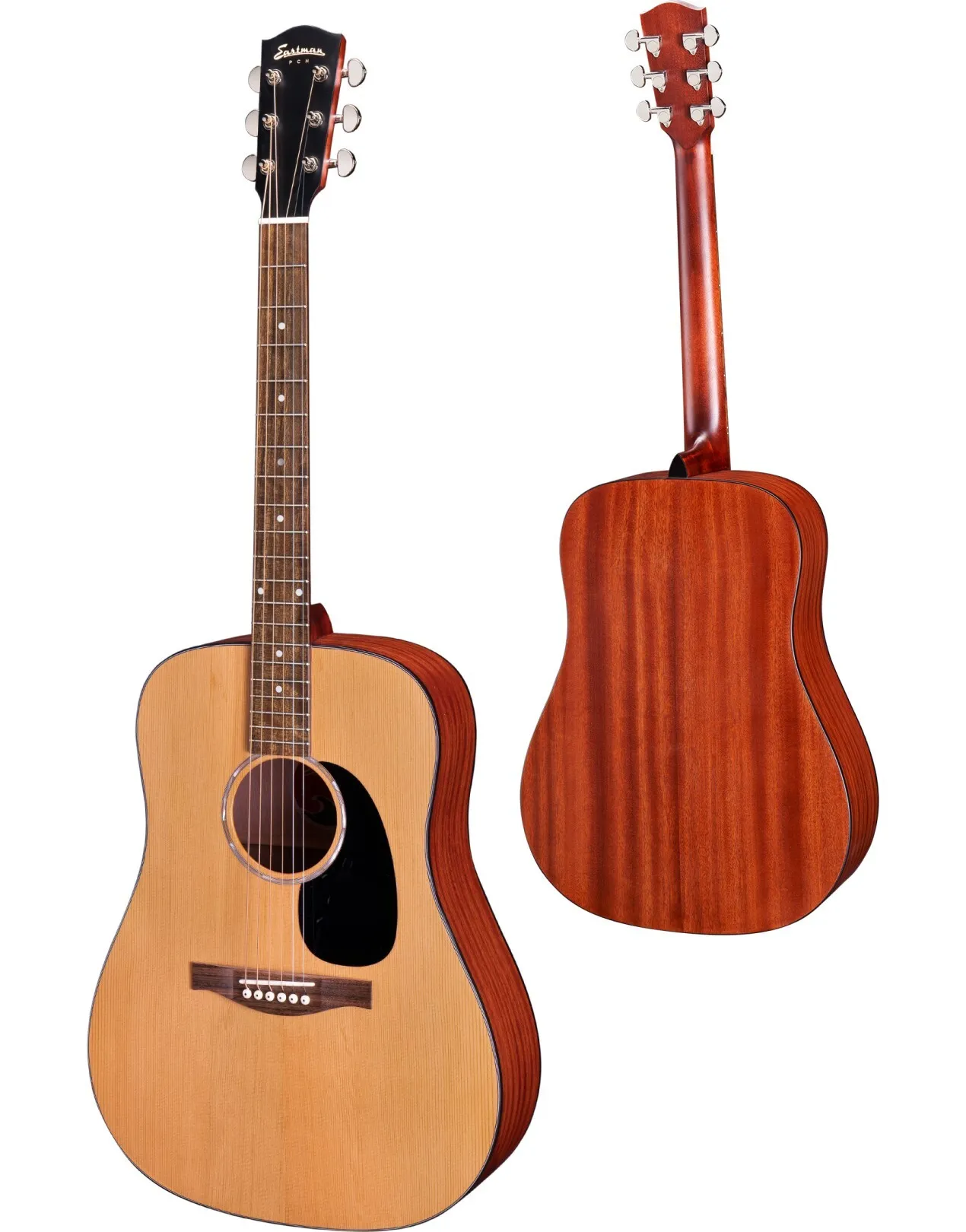 The Eastman PCH1-D Thermo-Cured Solid Top Dreadnought Acoustic Guitar Natural features a solid Thermo-Cured Sitka Spruce top, and laminated Sapele back & sides, for a naturally resonant and well-balanced acoustic tone. Eastman's thermal treatment gives the PCH1 the feel and tone of an aged-in guitar, delivering the perfect blend of fundamental tone and harmonics. The premium quality tonewoods look incredible with a Satin finish. A Traditional Even C-profile Okoume neck, with a Rosewood fretboard, offer smooth playability, and a dreadnought body shape give you hours of comfortable playability, and plenty of projection.