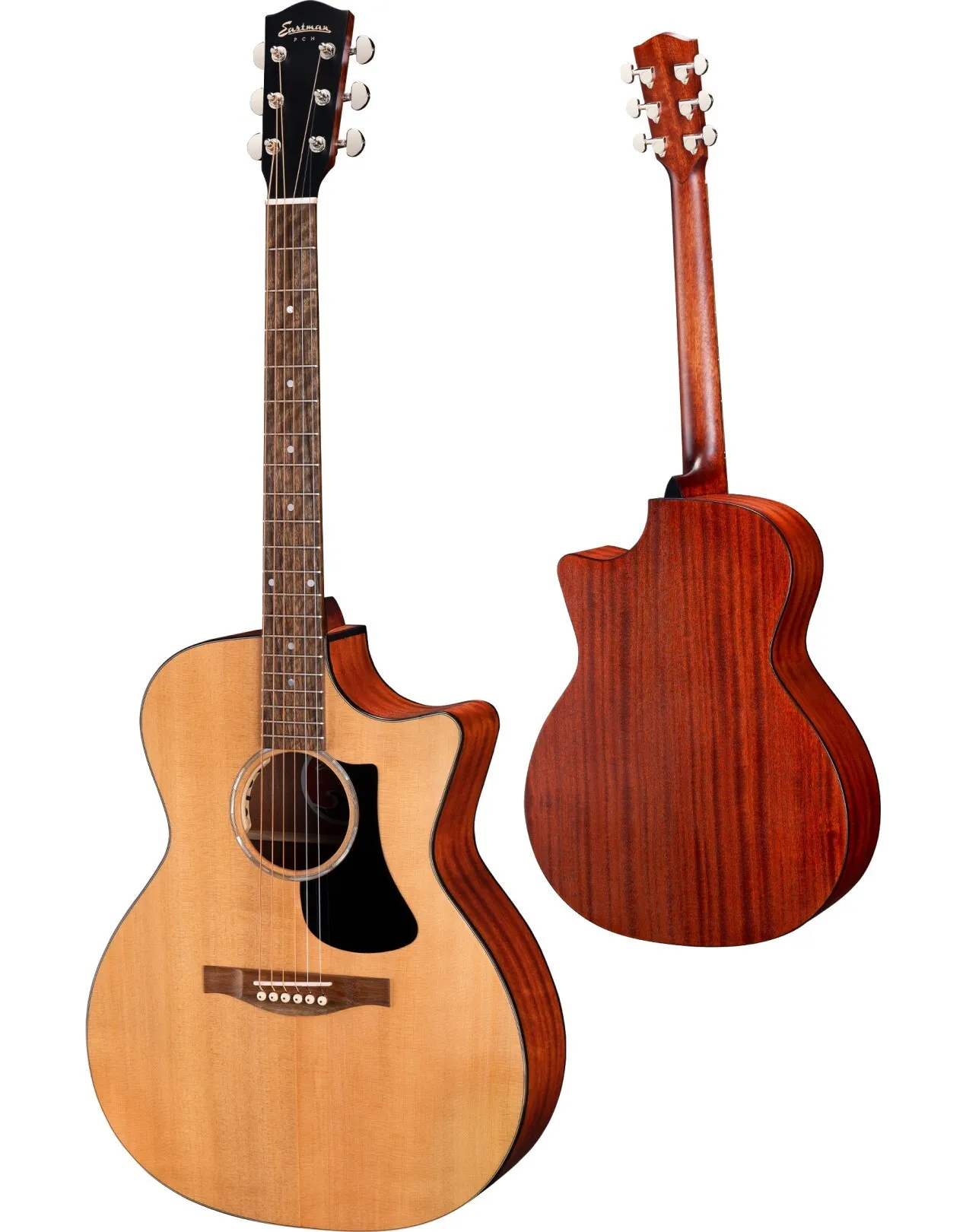 The Eastman PCH1-GACE Thermo-Cured Solid Top Grand Auditorium C/E Acoustic Guitar features a solid Thermo-Cured Sitka Spruce top, and laminated Sapele back & sides, for a naturally resonant and well-balanced acoustic tone. Eastman's thermal treatment gives the PCH1 the feel and tone of an aged-in guitar, delivering the perfect blend of fundamental tone and harmonics. The premium quality tonewoods look incredible with a Satin finish. A Traditional Even C-profile Okoume neck, with a Rosewood fretboard, offer smooth playability, and a grand auditorium body shape with cutaway gives you hours of comfortable playability. A Fishman pickup ensures your Eastman sounds just as good plugged in, as it does acoustically.