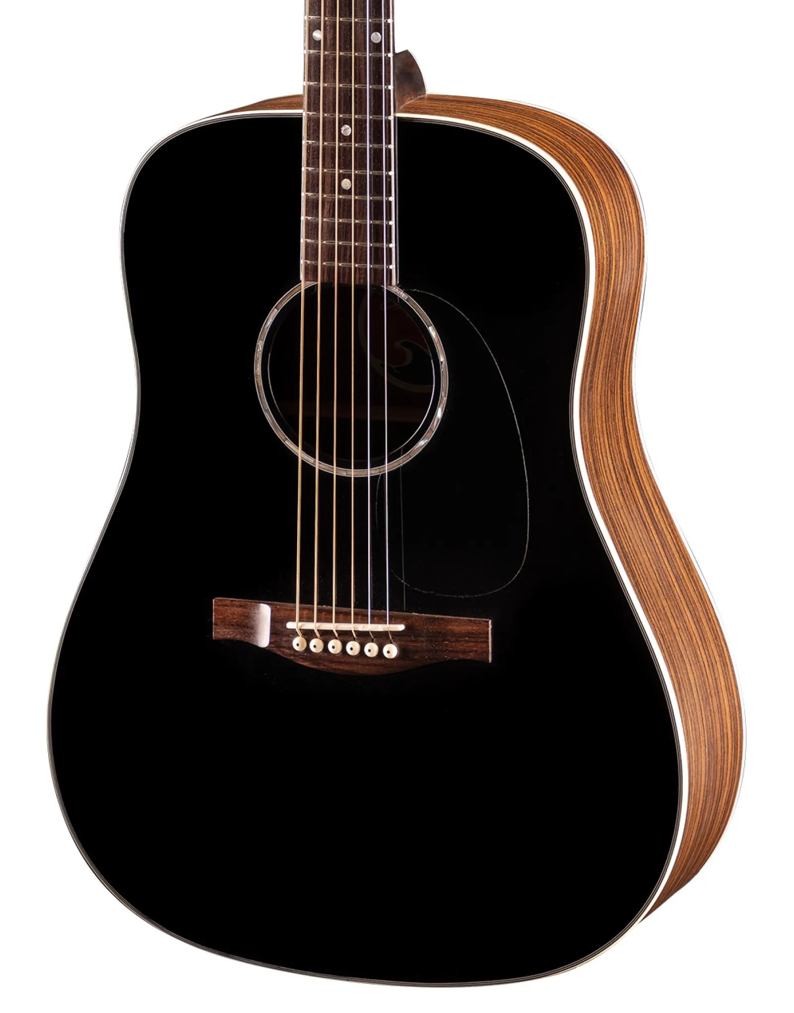 The Eastman PCH2-D-BK Thermo-Cured Solid Top Dreadnought Acoustic Guitar Black features a solid Thermo-Cured Sitka Spruce top, and laminated Rosewood back & sides, for a naturally resonant and well-balanced acoustic tone. Eastman's thermal treatment gives the PCH2 the feel and tone of an aged-in guitar, delivering the perfect blend of fundamental tone and harmonics. The premium quality tonewoods look incredible with a TrueTone Gloss Finish on the body and a TrueTone Satin finish on the neck. TrueTone is an environmentally friendly finish, with the same consistency and superior tonal characteristics as nitrocellulose. A Traditional Even C-profile Okoume neck, with a Rosewood fretboard, offer smooth playability, and a dreadnought body shape give you hours of comfortable playability, and plenty of projection.