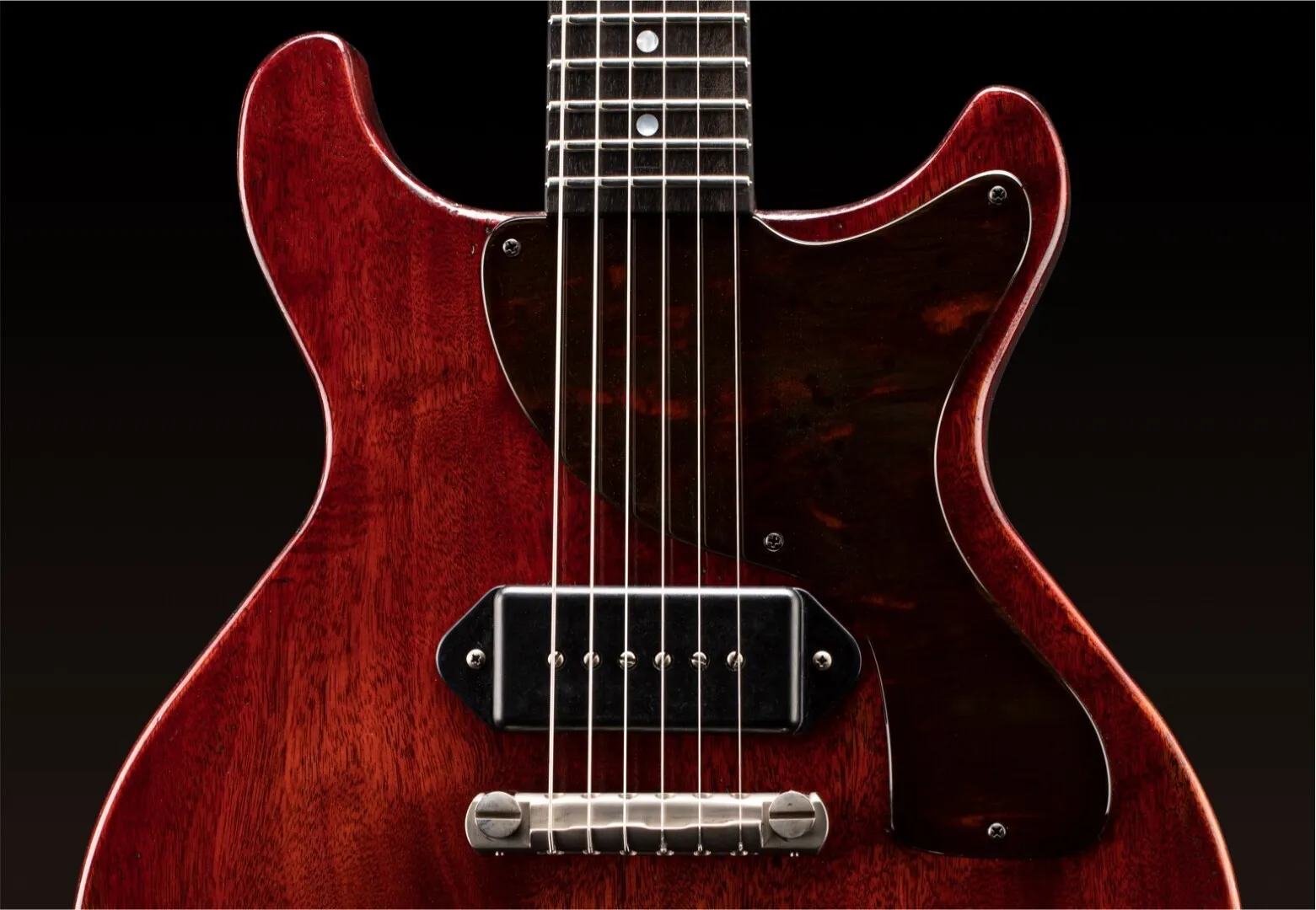 The Eastman SB55DC/TV Double Cut Electric Guitar, finished in Classic, features a capless single-piece slab Okoume Mahogany solid body, providing lightweight playability without skimping on tone. The incredible resonance of this instrument is thanks to a super smooth, super thin TrueTone Vintage Varnish finish, which also gives the SB55DC/TV a classic vintage aesthetic. These tonewoods and aesthetic are a match made in heaven with a single Lollar '50s spec P90 in the bridge. Perfect for warm, growling '50s style riffs that don't sacrifice on the details, this low output pickup produces a well-defined, bright tone, with minimal distortion - the result is plenty of room for chordal articulations and the subtlety of your playing to cut through the mix. Premium Faber hardware, including a compensated bridge, provides perfect intonation, while a no-load pot provides incredibly pure signal by bypassing itself from the signal chain when set to 10.