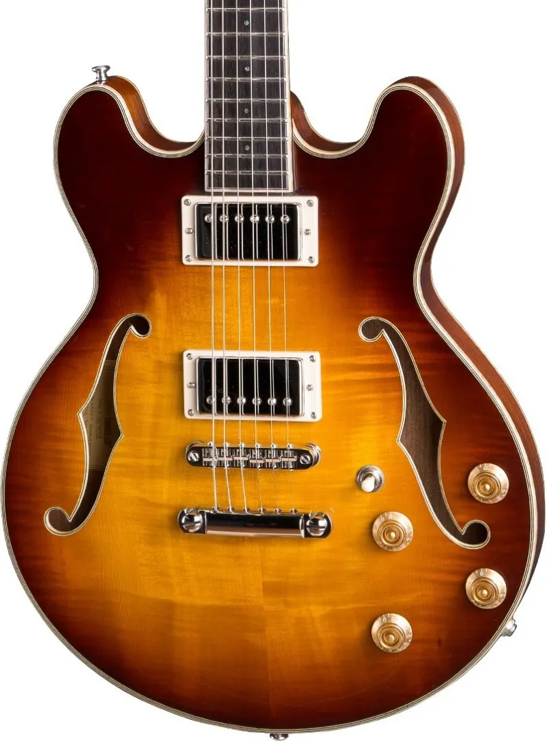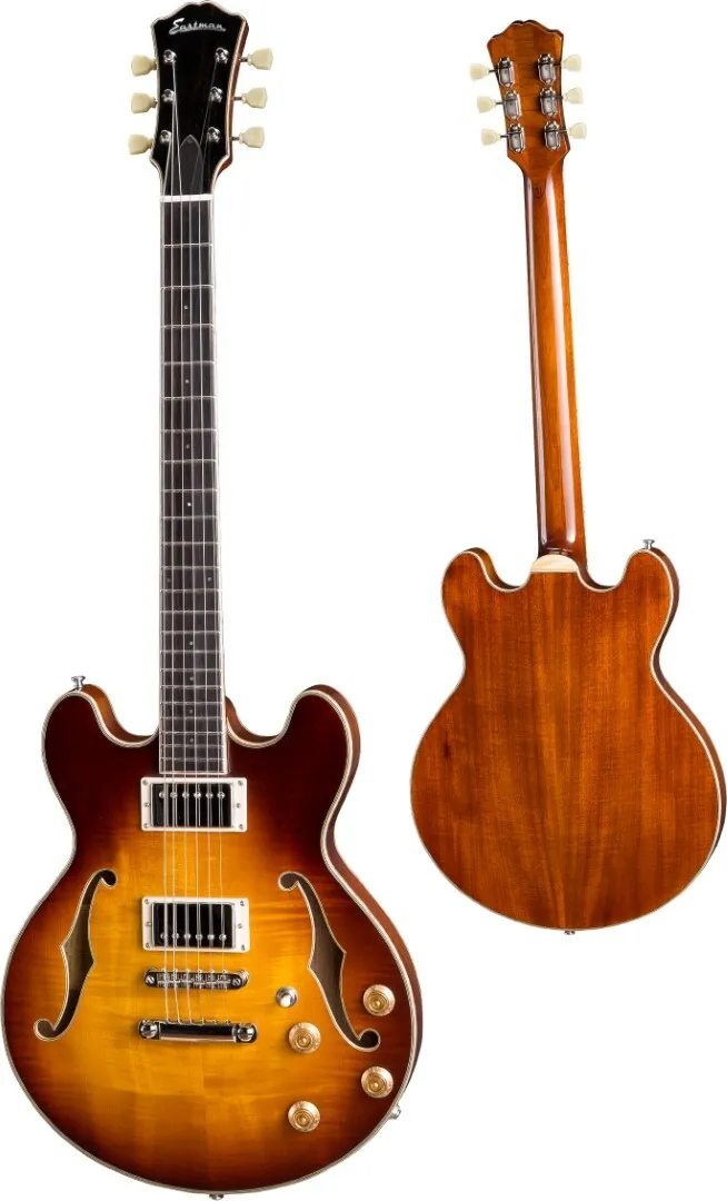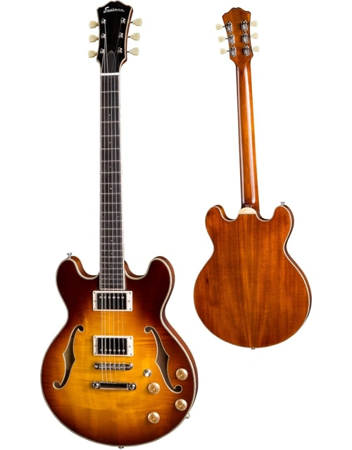 The Eastman T184MX-GB 14" Thinline Hollowbody, is a traditional 14" thinline hollow-body with a solid Maple top and solid Mahogany back and sides, finished in an incredible Gold Burst Gloss TrueTone finish. TrueTone is an environmentally friendly finish, with the same consistency and superior tonal characteristics as nitrocellulose. A traditional Even C-profile Mahogany neck, with 12"-radius Ebony fretboard, makes for buttery playability. A pair of Bare Knuckle Boot Camp Old Guard Custom Alnico II Humbuckers are designed specifically for high-end hollowbodies, giving the T184MX a warm, bright and dynamic tonal profile that's perfect for blues, rock, country, pop and jazz, and can even handle themselves when you turn up the gain. Besides its premium tonewoods and pickups, the Eastman T184MX has a range of other premium features, such as Flamed Maple binding, Jescar fretwire, Gotoh hardware, and Switchcraft electronics.