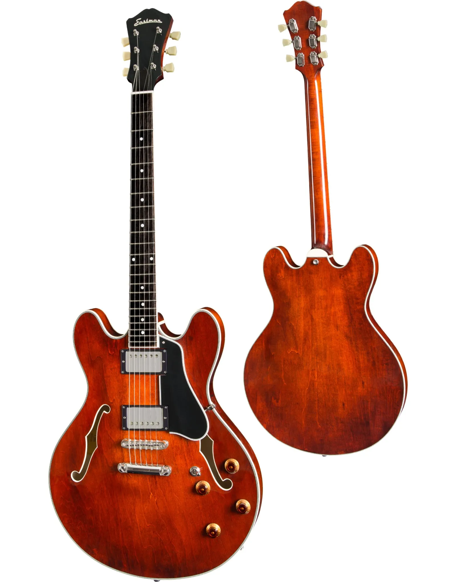 The Eastman T386 Thinline Electric Guitar, finished in Classic, is a traditional 16" thinline hollow-body which features a Laminate Maple body, Traditional Even C-profile Maple neck, and Ebony fingerboard, for smooth playability, and sweet vintage tone. A pair of Kent Armstrong HPAN-1 Humbuckers are perfect for warm, bluesy riffs, and smooth jazz licks, and can even handle it when you crank up the gain. The T386 features Eastman's Gloss TrueTone finish - TrueTone is an environmentally friendly finish, with the same consistency and superior tonal characteristics as nitrocellulose. Besides its premium tonewoods and pickups, the Eastman T386 has a range of other premium features, such as Jescar fretwire, Gotoh hardware, and Switchcraft electronics.