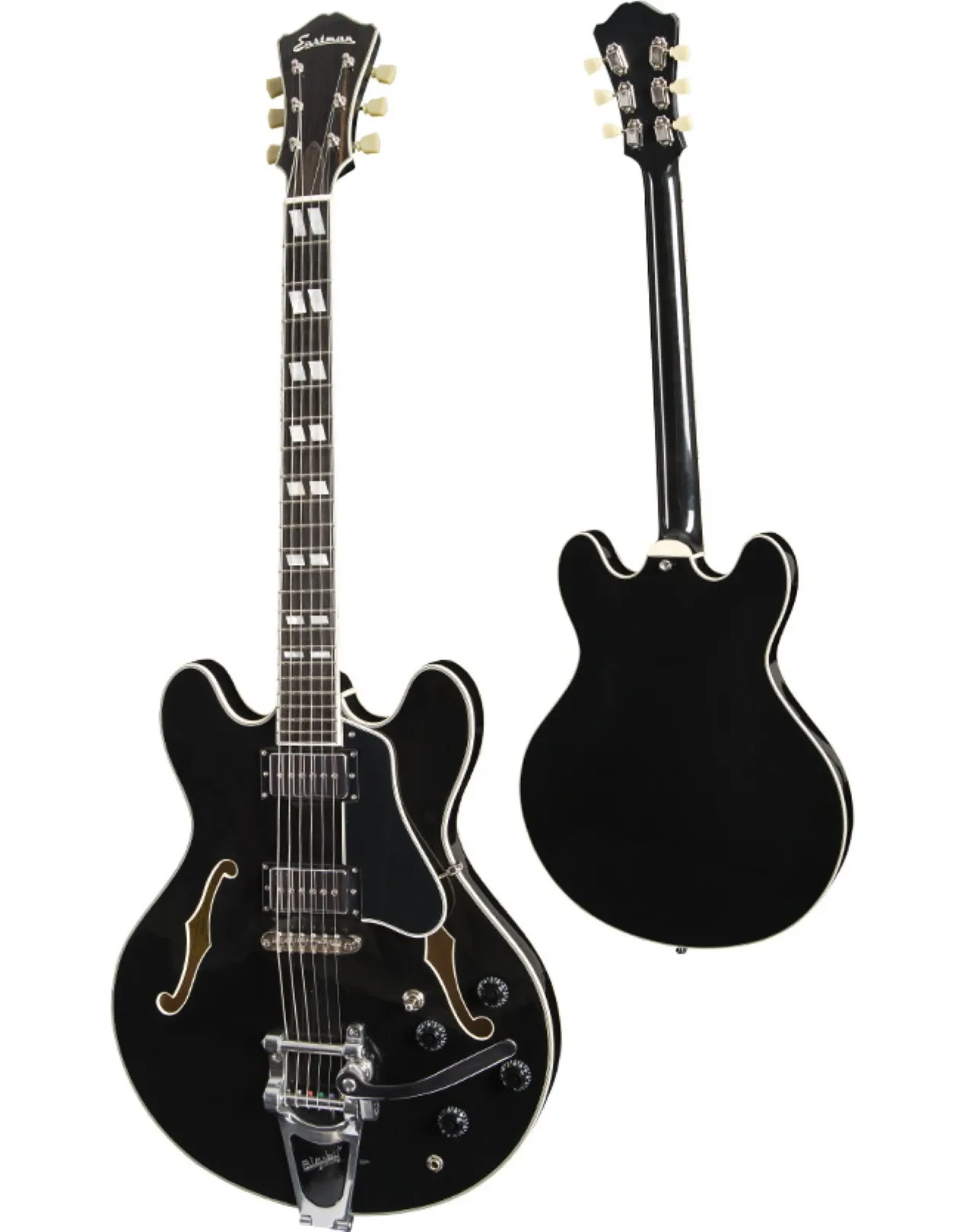 The Eastman T486B 16" Deluxe Thinline Hollowbody w/ Bigsby is the kind of guitar you want to pick up and play, every time you walk by it, and not only due to its incredible Black Gloss TrueTone finish. TrueTone is an environmentally friendly finish, with the same consistency and superior tonal characteristics as nitrocellulose. Think of the T486B as a guitarist's Swiss Army knife - it can handle nearly any genre that you throw at it, from blues, to jazz, rock, country, or rockabilly. It's no wonder the Eastman T486B is so versatile, with a deluxe laminated maple body and top, an ebony fretboard on a maple neck, Bigsby vibrato tailpiece, and a pair of Seymour Duncan Phat Cat pickups. These pickups add the thickness and warmth of P-90 tones, perfectly complementing the feedback-resistant design of this thinline hollowbody.