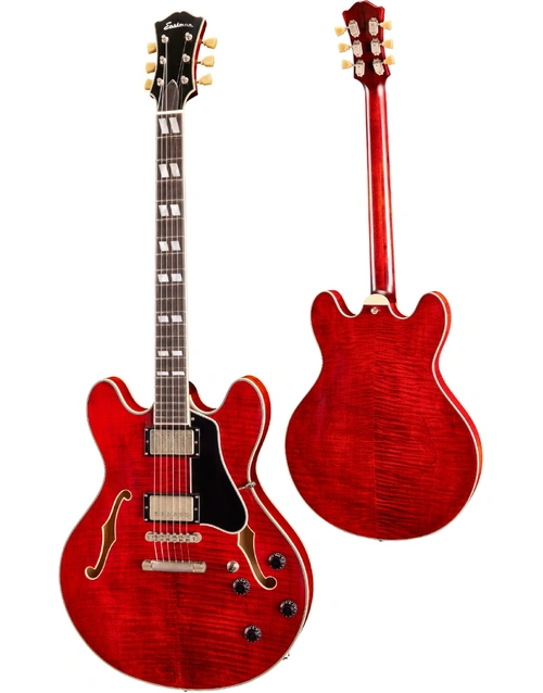 The Eastman T59/TV 16" Deluxe Thinline Hollowbody, features a deluxe laminated Flamed Maple body, Traditional Even C-profile Maple neck, and Ebony fingerboard, providing lightweight playability without skimping on tone. The tightly compressed laminate woods of Eastman's laminated maple bodies and tops dampen down overtones created by solid woods, and lend themselves to perfect tone production in louder environments. Every one of Eastman's laminated thinlines has a centre block that runs the length of the body right down the centre, which aids in the suppression of feedback and reinforces the top. The incredible resonance of this instrument is further enhanced by a super smooth, super thin Truetone Vintage Gloss finish, which also gives the T59/TV a classic vintage aesthetic.