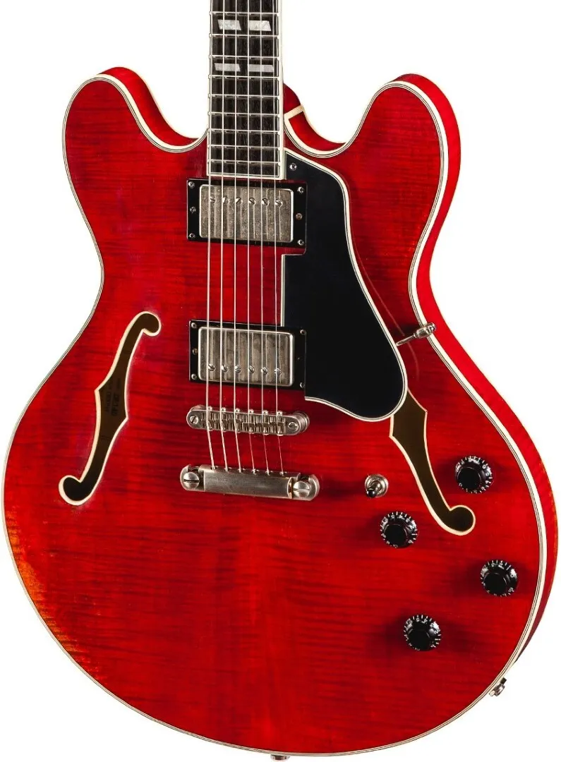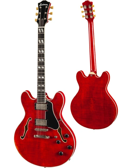 The Eastman T59/V-RD 16" Deluxe Thinline Hollowbody, features a deluxe laminated Flamed Maple body, Traditional Even C-profile Maple neck, and Ebony fingerboard, providing lightweight playability without skimping on tone. The tightly compressed laminate woods of Eastman's laminated maple bodies and tops dampen down overtones created by solid woods, and lend themselves to perfect tone production in louder environments. Every one of Eastman's laminated thinlines has a center block that runs the length of the body right down the center, which aids in the suppression of feedback and reinforces the top. The incredible resonance of this instrument is further enhanced by a super smooth, super thin Antique Red Varnish finish, which also gives the T59/V a classic vintage aesthetic.