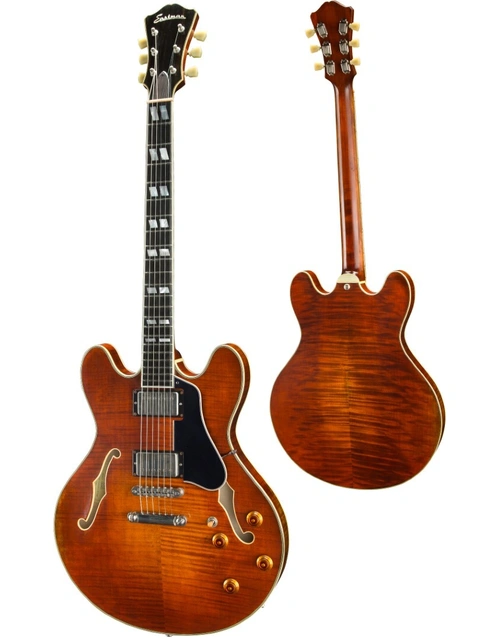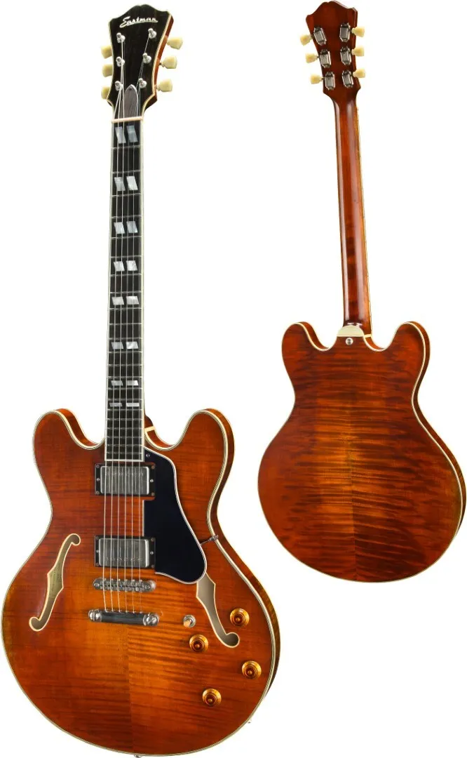 The Eastman T59/V 16" Deluxe Thinline Hollowbody, features a deluxe laminated Flamed Maple body, Traditional Even C-profile Maple neck, and Ebony fingerboard, providing lightweight playability without skimping on tone. The tightly compressed laminate woods of Eastman's laminated maple bodies and tops dampen down overtones created by solid woods, and lend themselves to perfect tone production in louder environments. Every one of Eastman's laminated thinlines has a center block that runs the length of the body right down the center, which aids in the suppression of feedback and reinforces the top. The incredible resonance of this instrument is further enhanced by a super smooth, super thin Antique Classic Varnish finish, which also gives the T59/V a classic vintage aesthetic.