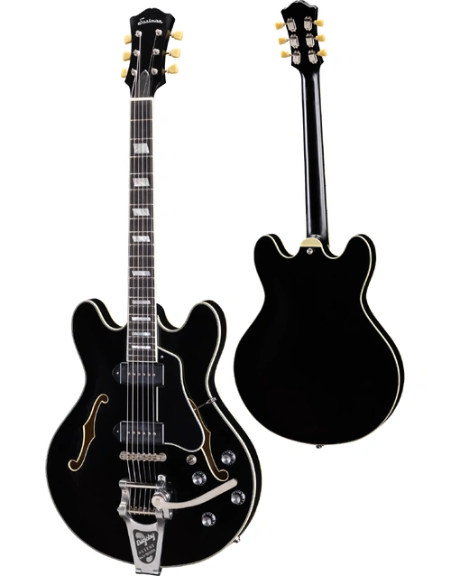 The Eastman T64/TV-LTD-BK 16" Limited Edition Deluxe Thinline Hollowbody w/ Bigsby in Truetone Vintage Black Gloss is an exquisite blend of vintage charm and modern performance. Featuring a deluxe maple laminate body and a maple neck with an ebony fingerboard, this guitar offers smooth playability and rich, resonant tone. The neck is fitted with Jescar fretwire and has a 12" radius for a comfortable playing experience. The Lollar Dogear P90 pickups produce a warm, bluesy tone that’s perfect for a wide range of styles, from jazz to rock. The US Bigsby B7 tailpiece provides classic vibrato action, while the Gotoh relic hardware adds to its vintage appeal. The guitar’s Truetone Vintage Gloss finish, with its ivoroid binding, enhances the overall aesthetic, giving it an unmistakable vintage feel with modern playability.