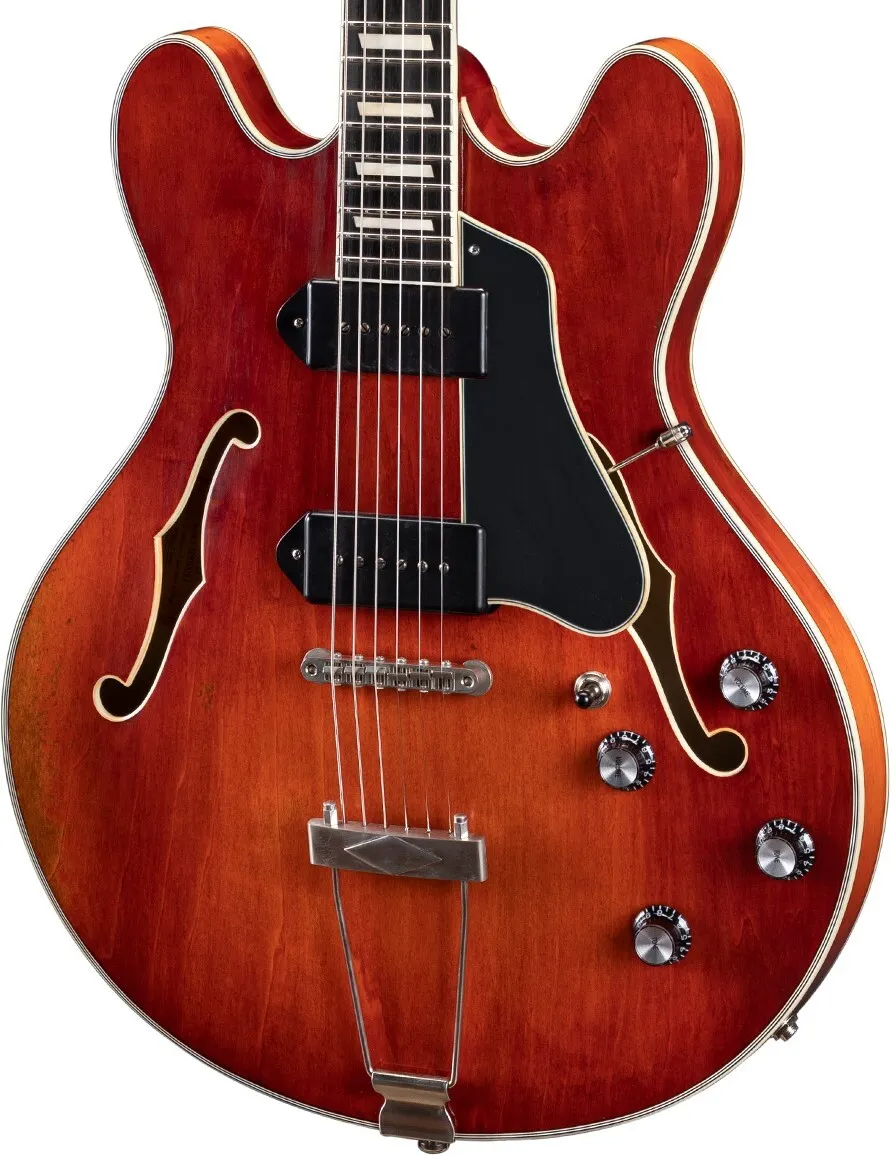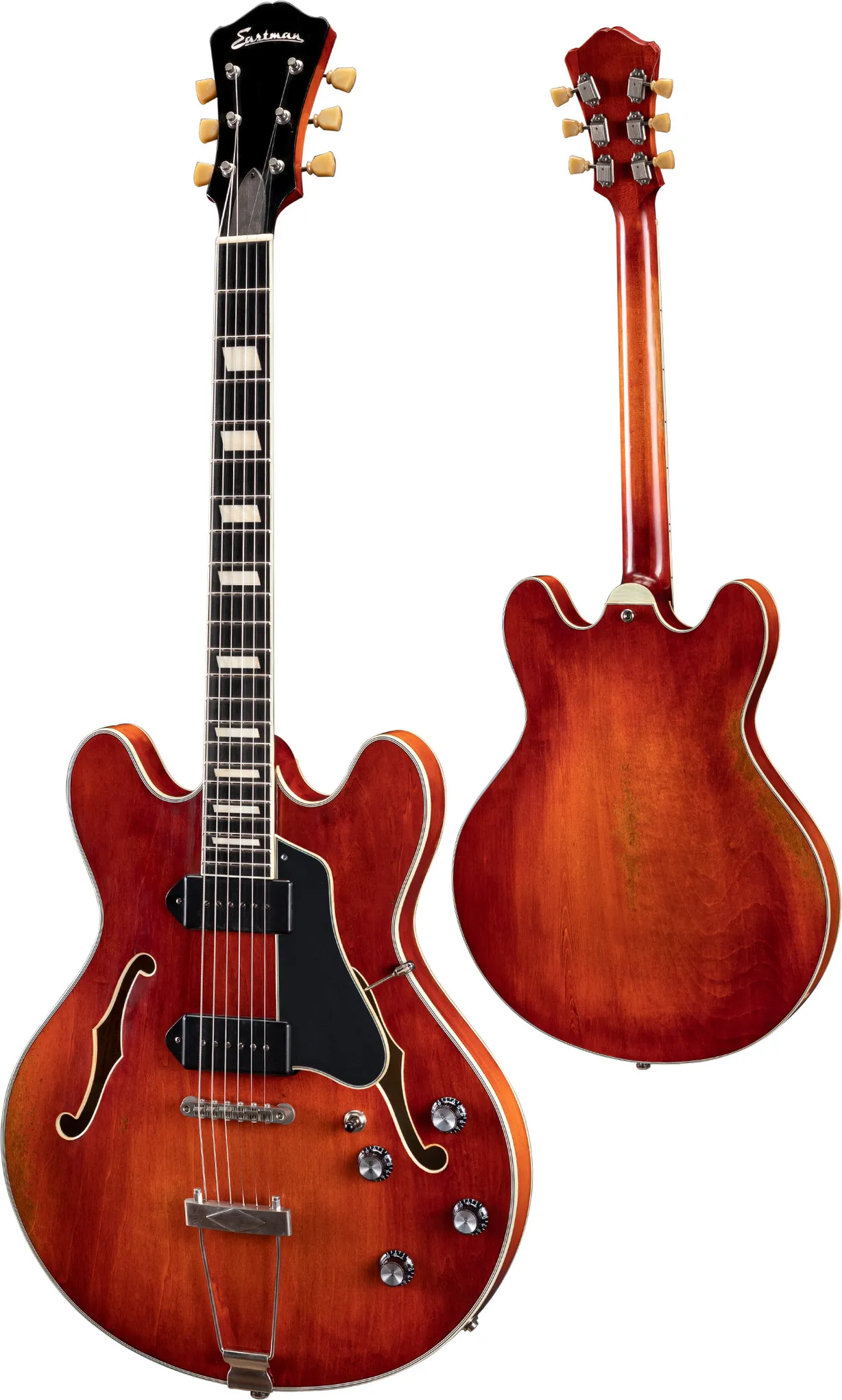 The Eastman T64/V-T 16" Deluxe Thinline Hollowbody w/ Trapeze, is a thinline hollow-body which features a Deluxe Laminate Maple body, Traditional Even C-profile Maple neck, and Ebony fingerboard, for smooth playability, and sweet vintage tone. The tightly compressed laminate woods of Eastman's laminated maple bodies and tops dampen down overtones created by solid woods, and lend themselves to perfect tone production in louder environments. Every one of Eastman's laminated thinlines has a center block that runs the length of the body right down the center, which aids in the suppression of feedback and reinforces the top. The incredible resonance of this instrument is further enhanced by a super smooth, super thin Antique Classic Varnish finish, which also gives the T64/V-T a classic vintage aesthetic. A pair of Lollar P-90s are perfect for warm, bluesy riffs, and dialed-back jazz licks, and can even handle it when you crank up the gain. Gotoh Relic Series hardware, combined with its Antique Varnish finish, give the Eastman T64/V-T that played-in look and feel.
