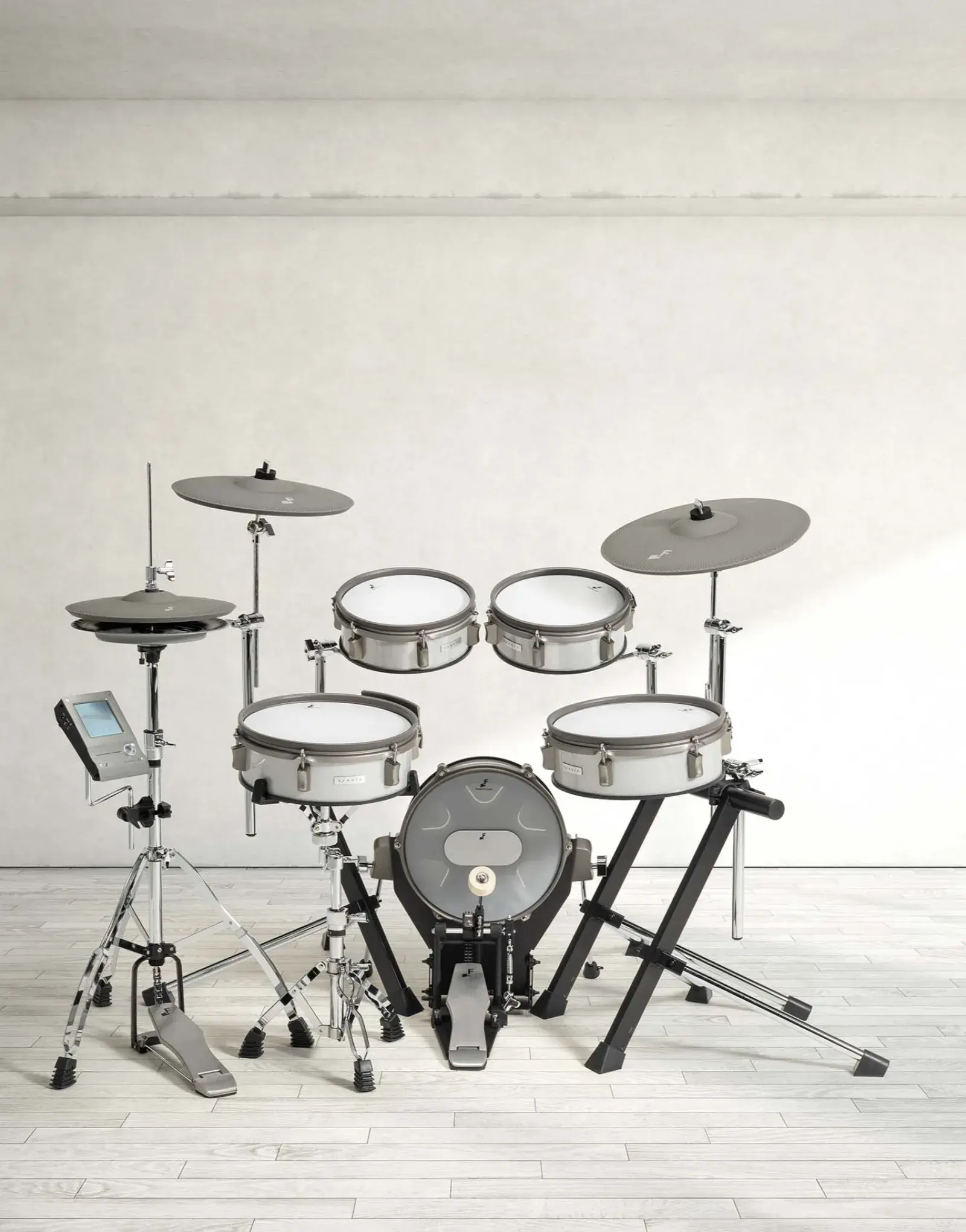 Playability is driven by patented sensing technologies. The Tru-Motion two-piece hi-hat uses multi-optical sensing to track motion in three dimensions, allowing tight foot control, smooth transitions, and consistent response across the cymbal surface. The ELISE sensing processor ensures fast trigger response and accurate dynamic tracking, which is especially noticeable during softer playing and technical practice.