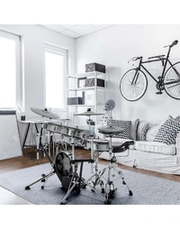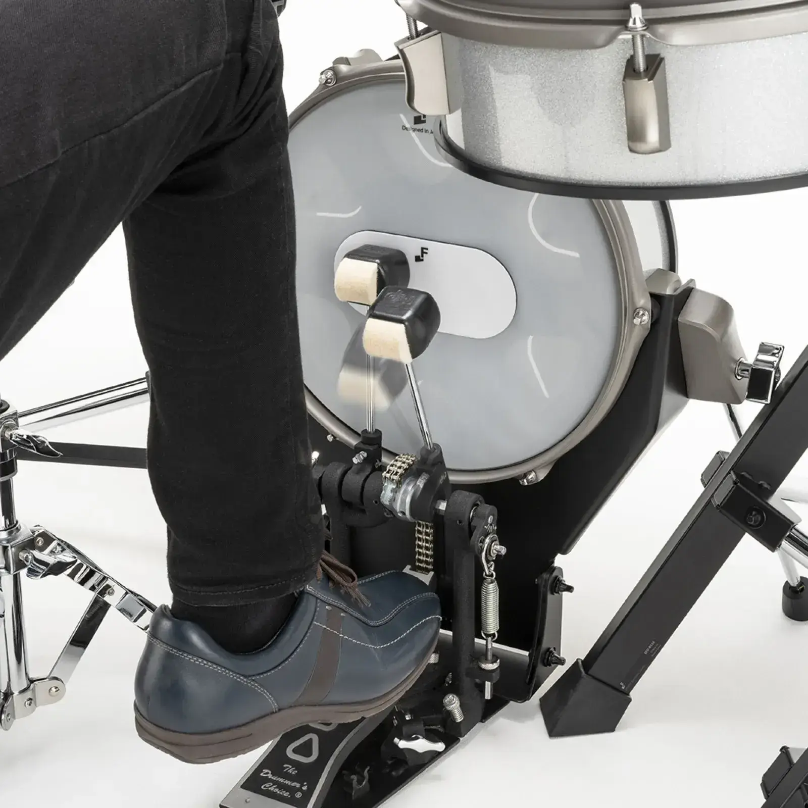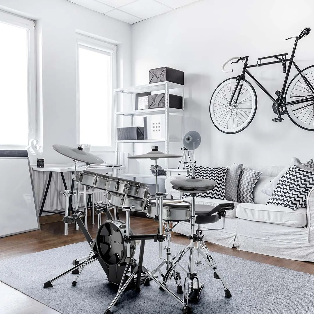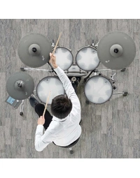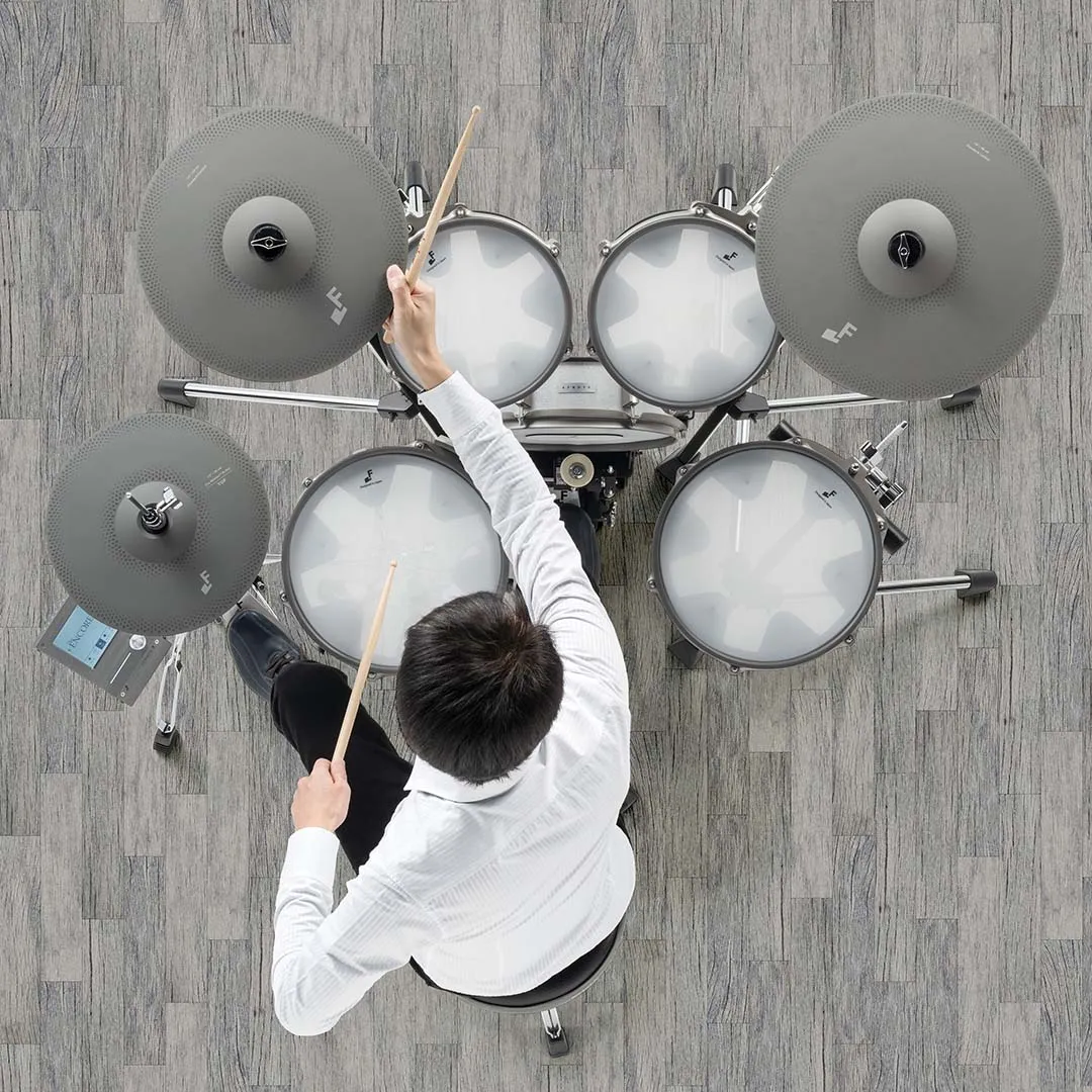 The kit uses full-depth-style pads with monocoque FRP shells for rigidity and consistent rebound. The 12 inch kick pad offers stable tracking for single or double pedal use, while mesh heads across the snare and toms provide controlled rebound and reduced fatigue. Three-zone cymbals with 360-degree sensing support edge, bow, and cup articulation without dead spots.