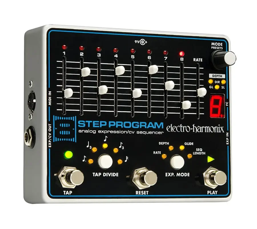 The Electro-Harmonix 8 Step Program Analogue Expression Control Voltage (CV) Sequencer Pedal gives musicians and sound designers powerful control over modulation and expression parameters. With eight programmable steps, it can sequence oscillators, filters, delay parameters, and more—transforming static tones into evolving soundscapes. Set tempo manually or sync via MIDI clock, and explore rhythmic variety using six Tap Tempo Divide modes. Four sequence direction options—Forward, Reverse, Bounce, and Random—expand creative flexibility, while ten onboard presets offer instant recall. The optional 8 Step Program Foot Controller increases storage to 100 presets, and the included power supply ensures it’s ready for any setup.