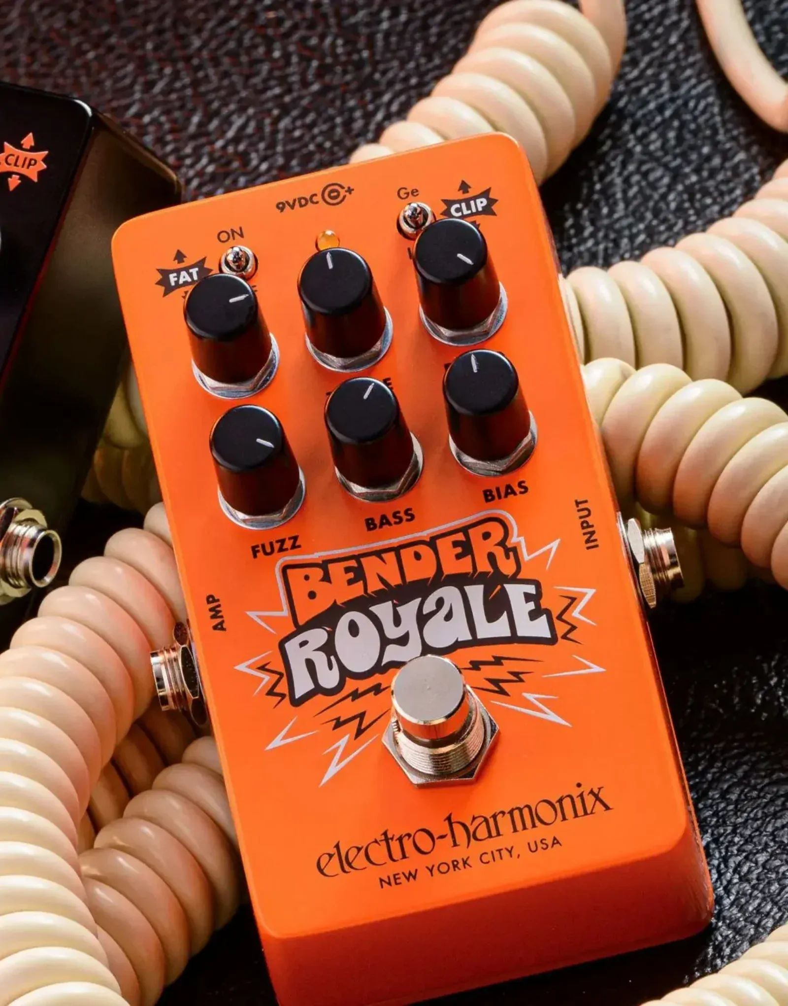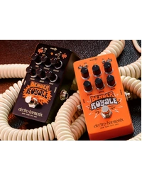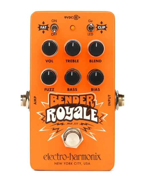 The Electro-Harmonix Bender Royale delivers vintage germanium fuzz tone inspired by the legendary Mkiii three-transistor design, now reimagined with expanded tonal control. From smooth saturation to sputtering grit, the Bender Royale’s combination of VOL, FUZZ, and BASS knobs lets you dial in everything from warm rhythm fuzz to razor-sharp leads. Modern upgrades include a FAT switch for boosted low-end, CLIP switch for changing clipping structure, and a BIAS control for fine-tuning the fuzz texture. Add in a TREBLE EQ and BLEND mix for precision tone shaping, and this limited-edition orange pedal becomes a fuzz lover’s dream.