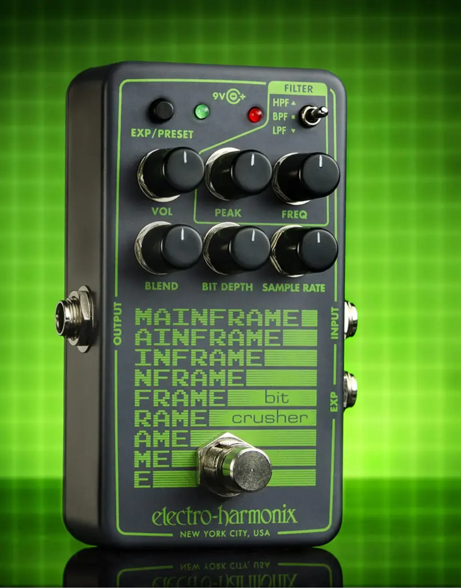 The Electro-Harmonix Mainframe Digital Bit Crusher Pedal w/ High / Low / Band-Pass Filter brings vintage digital grit to your modern rig. Capable of reducing sample rates from 48kHz to 110Hz and crushing bit depth from 24-bit to 1-bit, it transforms pristine tones into raw, lo-fi textures reminiscent of classic gaming consoles and vintage computers. The selectable High, Low, and Band-Pass filter shapes the crushed signal for creative tone sculpting, while Sample Rate Tuning Mode locks the effect to your instrument’s pitch or key for musical precision. With expression pedal compatibility, programmable presets, and secondary controls for fine-tuning, the Mainframe delivers everything from subtle digital decay to full-on sonic destruction.