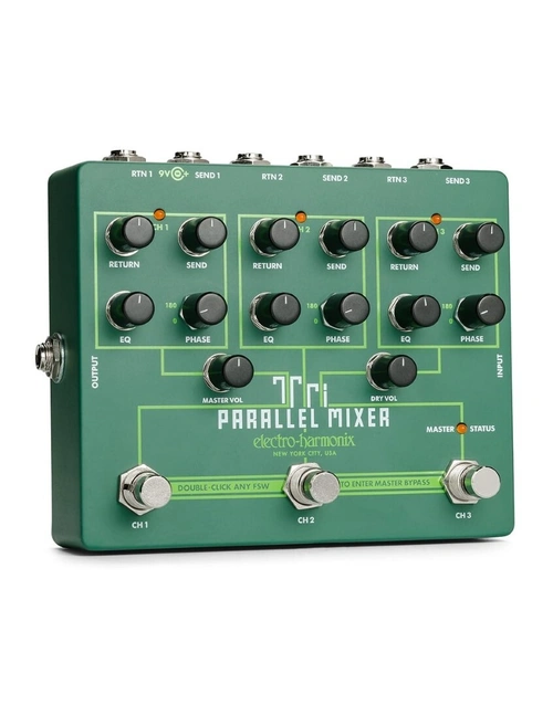 The EHX TriParallel Mixer is a powerful effects creation and mixing hub with three separate FX loops and flexible controls allow for multiple configurations.