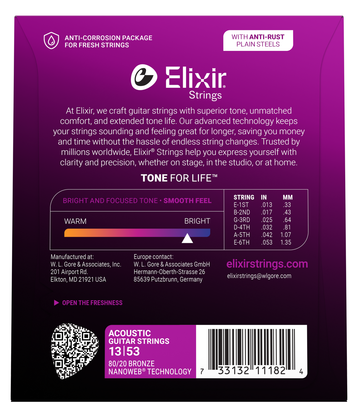 Elixir Nanoweb 80/20 Bronze Acoustic Guitar Strings deliver a bright, lively tone with extended life thanks to their ultra-thin coating that protects every string. This coating prevents dirt and grime from building up between windings, ensuring consistent performance and long-lasting clarity. The smooth feel makes them easy on the fingers, while also reducing finger squeak for both live performance and recording. Anti-Rust plated plain steel strings resist corrosion to extend the lifespan of the entire set. With less need for frequent string changes, these strings provide a reliable option for guitarists who want more time playing and less time maintaining. At Riffs & Licks Music, we think these strings combine bright tone, comfort and durability in one dependable set.