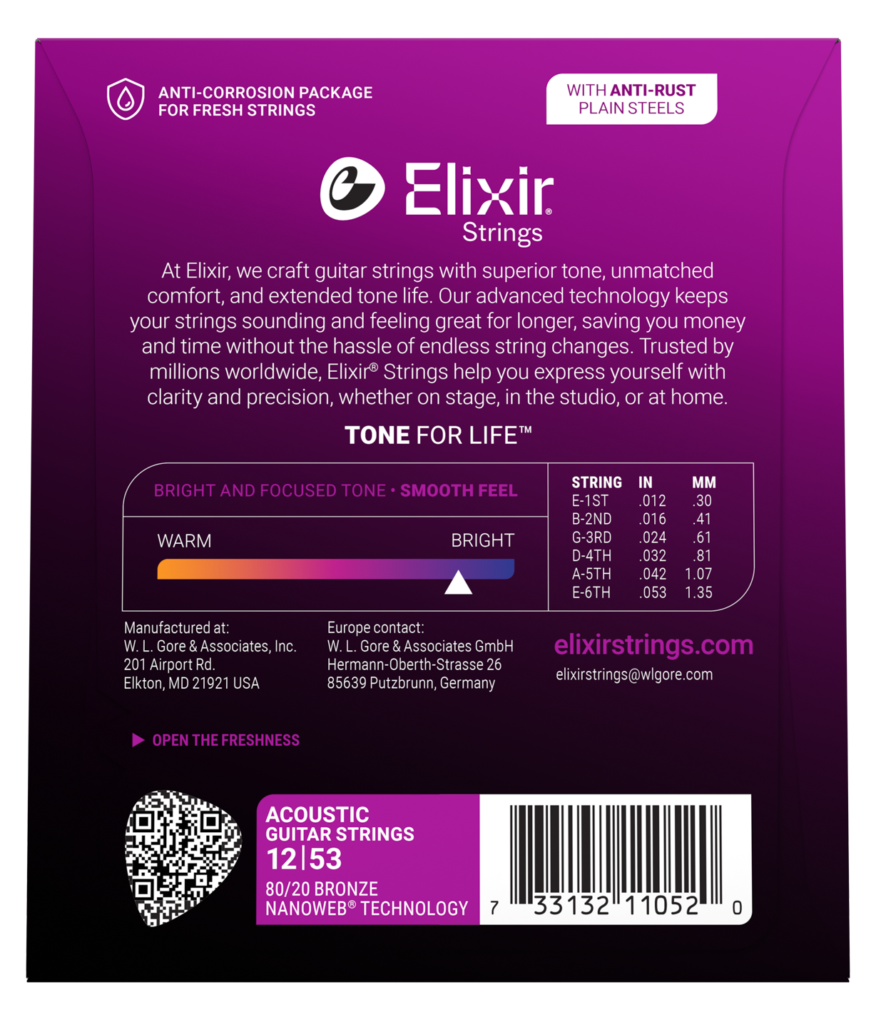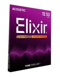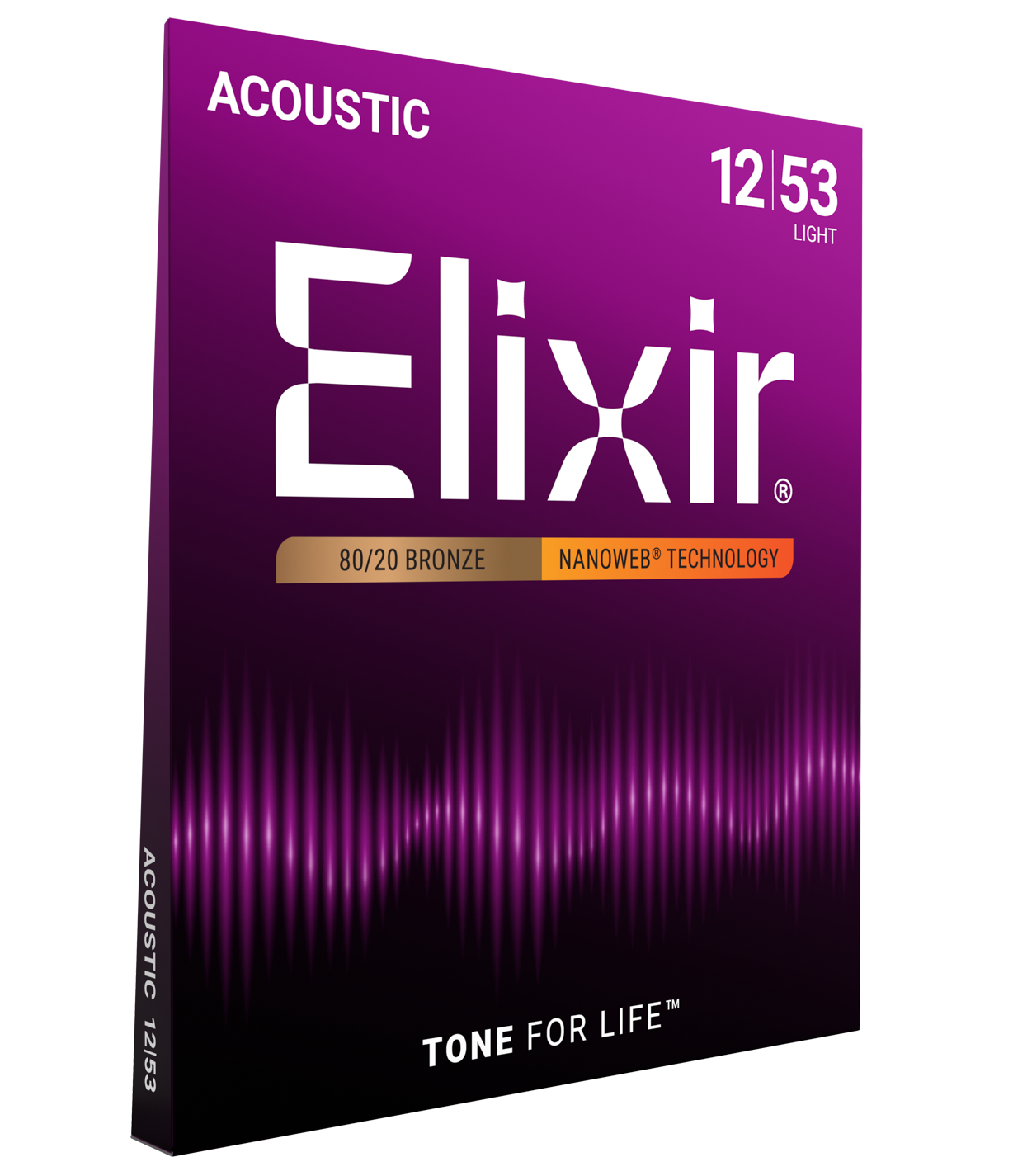 Elixir Acoustic Nanoweb 80/20 Light 12-53 strings provide the longest lasting tone, night after night. These strings deliver a bright, lively sound with the extended tone life that Elixir Strings are renowned for. The NANOWEB coating protects the entire string with an ultra-thin layer, preventing gunk buildup and maintaining consistent performance.