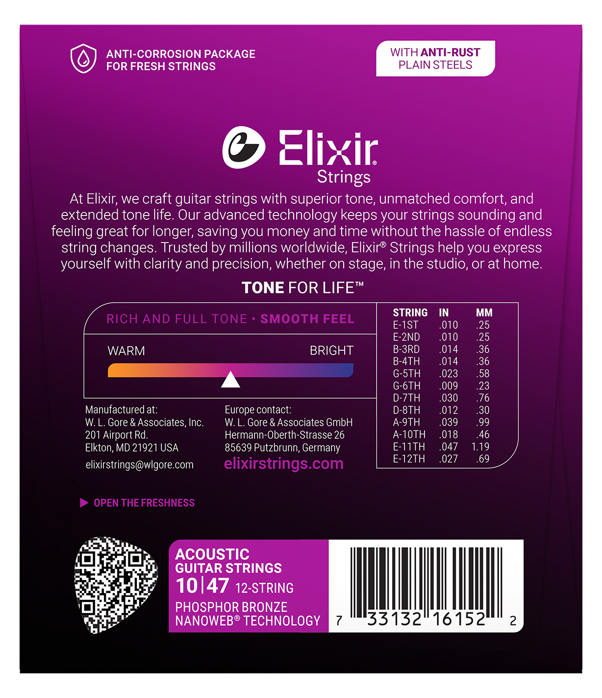 Elixir Acoustic Phosphor Bronze Strings with Nanoweb Coating deliver a warm, sparkling tone with exceptional clarity and extended life. The ultra-thin coating protects the entire string, keeping debris out of the windings while preserving brightness and consistency. These strings provide a smooth, comfortable feel that enhances playability, with reduced finger squeak making them ideal for both live performance and studio work. Anti-Rust plated plain steel strings resist corrosion, ensuring durability across the entire set. Designed for players who want reliable tone that lasts, these strings reduce the hassle and cost of frequent changes. At Riffs & Licks Music, we think these strings combine rich tone, smooth playability and long-lasting performance that acoustic players will appreciate.