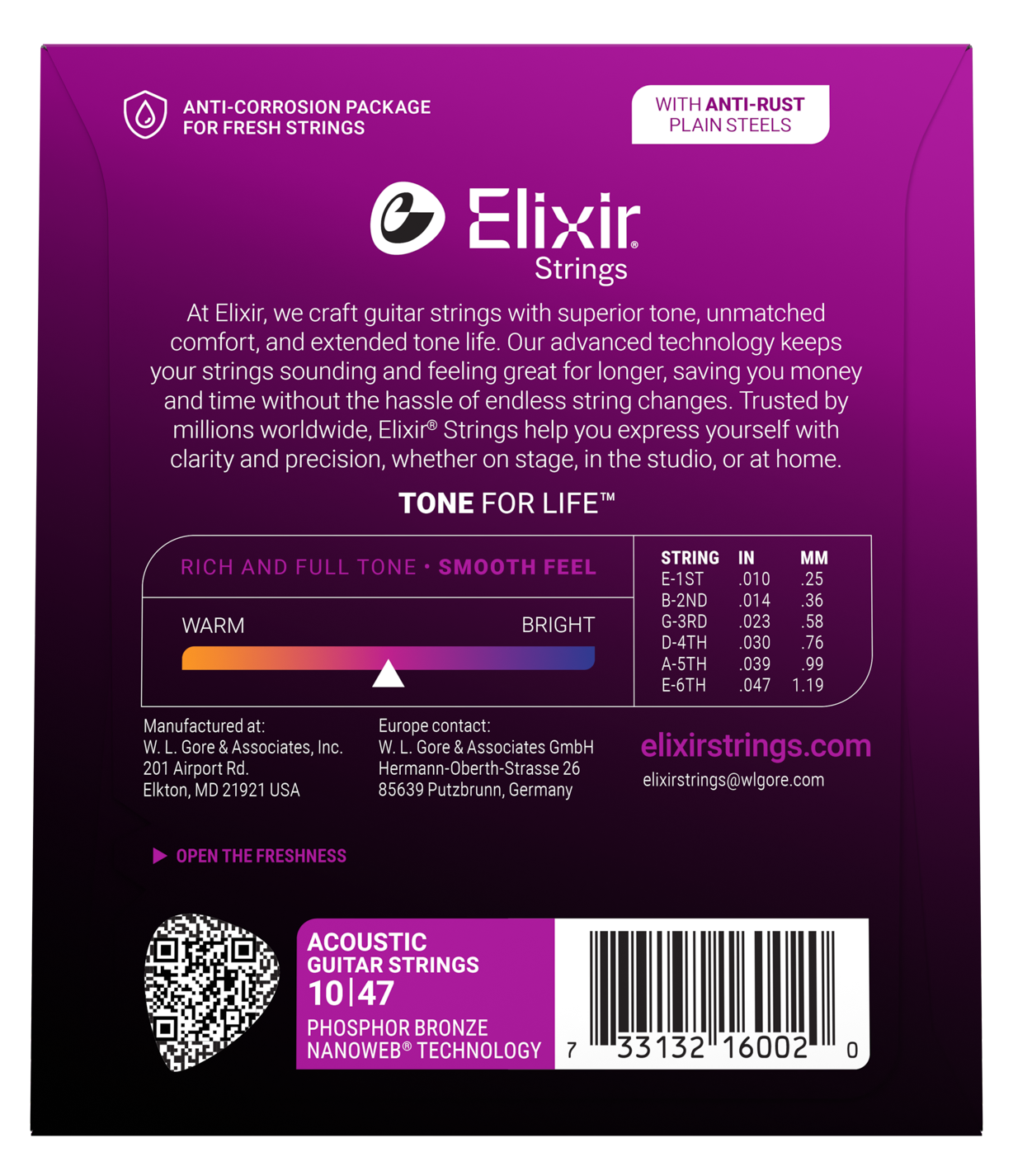 Elixir Acoustic Nanoweb Phosphor Bronze Extra Light 10-47 Guitar Strings - 16002